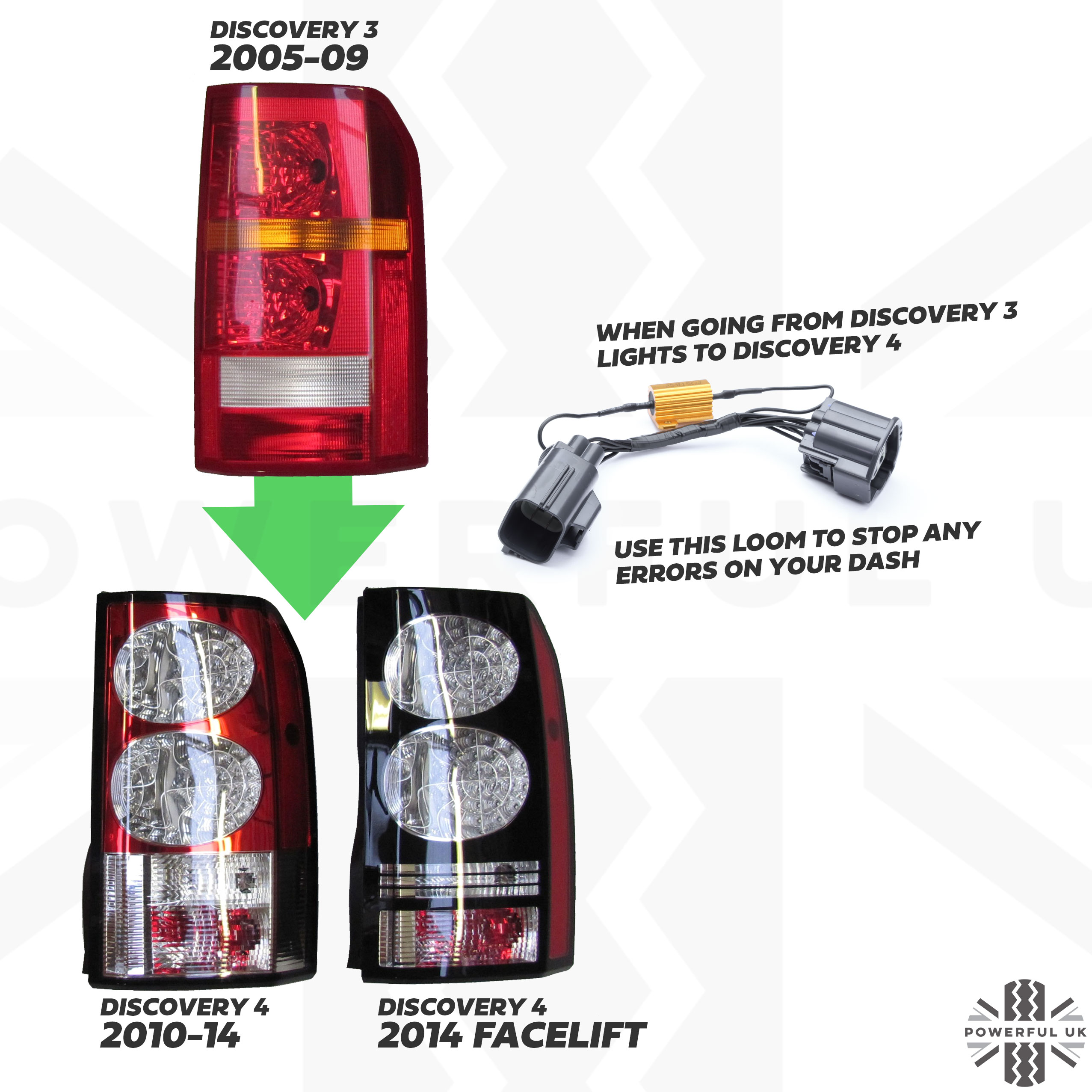 These 'plug and play' looms will allow you to fit the later Discovery 4 (2010 +) LED rear lights to the earlier Discovery 3 (2005 -09) without generating an error on your dash.
