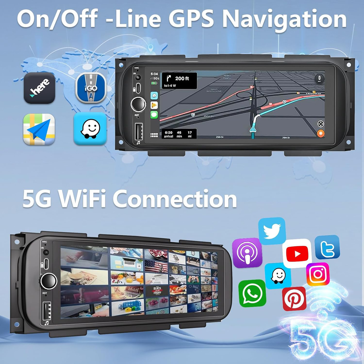 5. GPS navigation: Built-in navigation module, support on-line off-line navigation, support Google Map, Waze, iGo Map etc.