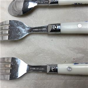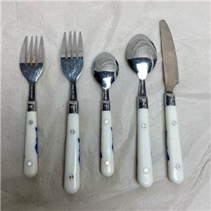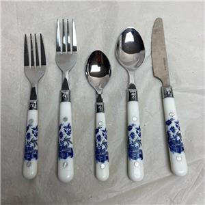 This is a beautiful 5-pc Blue Willow Flatware or Cutlery Set made of stainless with melamine handles, depicting the popular blue willow pattern. The Blue Willow design is not original to the set or was added by Blue Willow enthusiast. The set includes the following:
