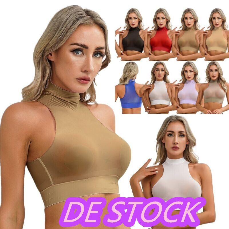 Ärmellos, runder Ausschnitt, asymmetrischer Rückenausschnitt mit Schulterumfang Trägern. Überkreuzte Träger verlaufen über den ausgeschnittenen Rücken.