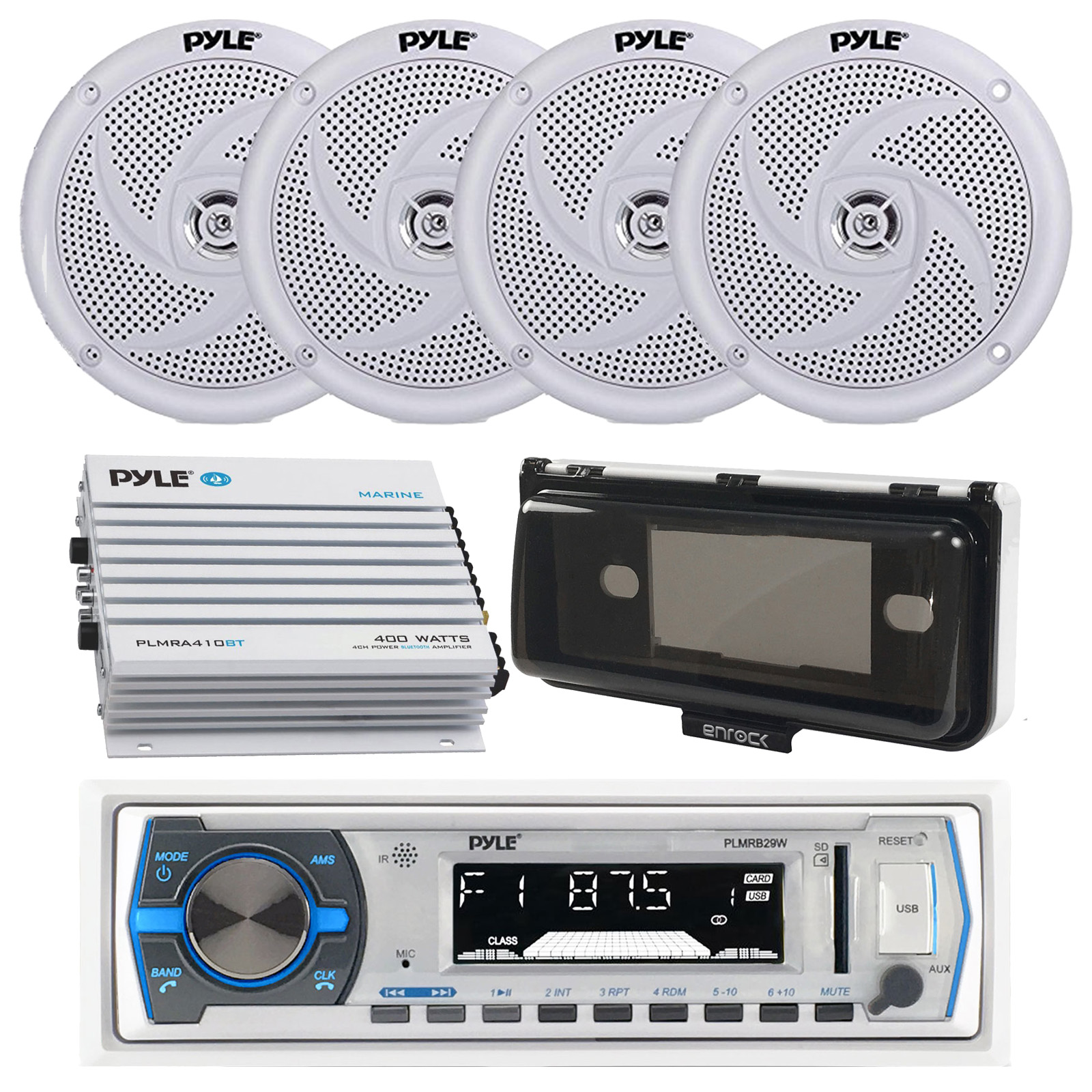 4-Channel Bluetooth Amp, 4x 5.25" 180W 2-Way Low Profile Slim Style Boat White Audio Speakers, Pyle PLMRB29W Single DIN Bluetooth Marine MP3 In-Dash Stereo Receiver with White Radio Cover