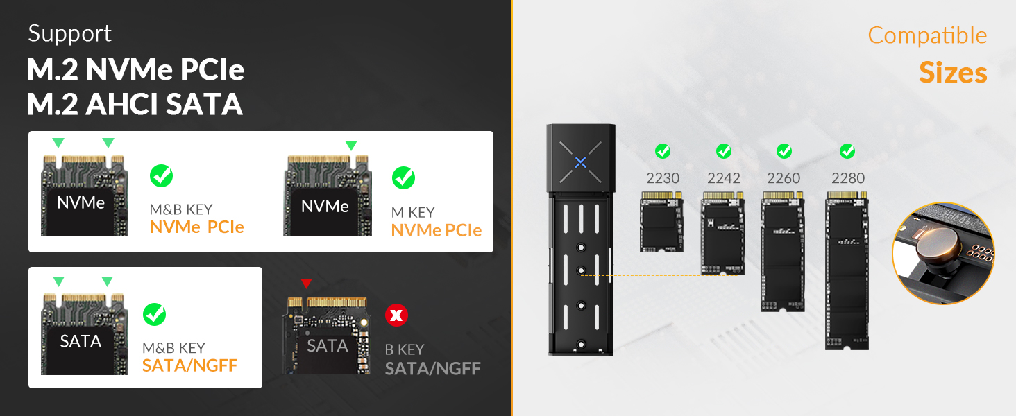 - 【Unterstützt NVMe PCIe & AHCI SATA/NGFF】 Dieses M.2 NVMe SATA SSD-Gehäuse ist kompatibel mit (M-Key/M+B Key) M.2 NVMe PCIe SSD, kompatibel mit (M+B Key) M.2 AHCI SATA/NGFF-SSD. Nicht kompatibel mit (B-Key) SATA/NGFF SSD.