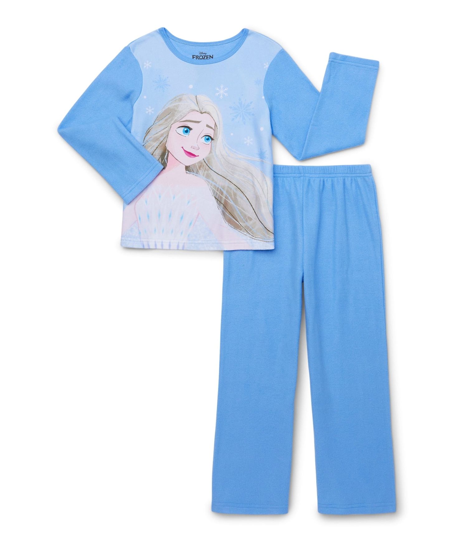 This charming pajama set features a vibrant graphic of Elsa from Frozen, which is sure to be a favorite. The top has long light blue sleeves and a ribbed crew neck collar for added comfort and style. The solid blue pajama pants are designed with an elasticized waistband, allowing for a customizable fit. Made from 100% soft and cozy polyester, this set ensures a warm and comfortable night's sleep. It's perfect for lounging around at home or as a delightful gift for any Frozen fan.