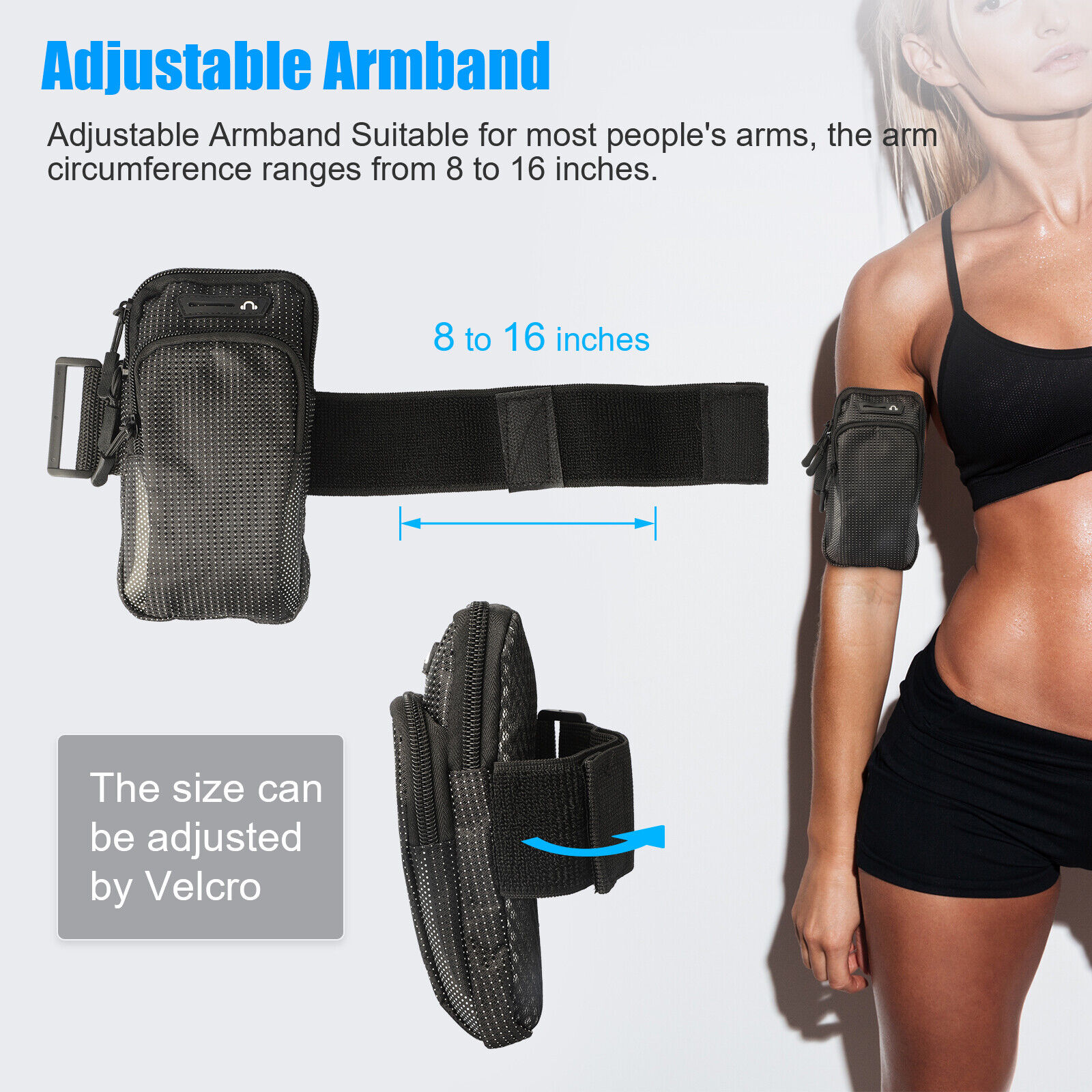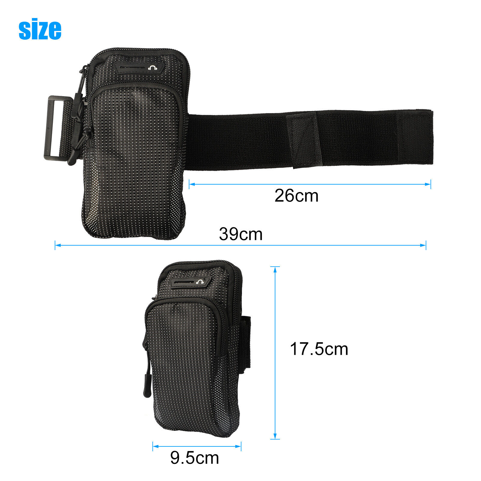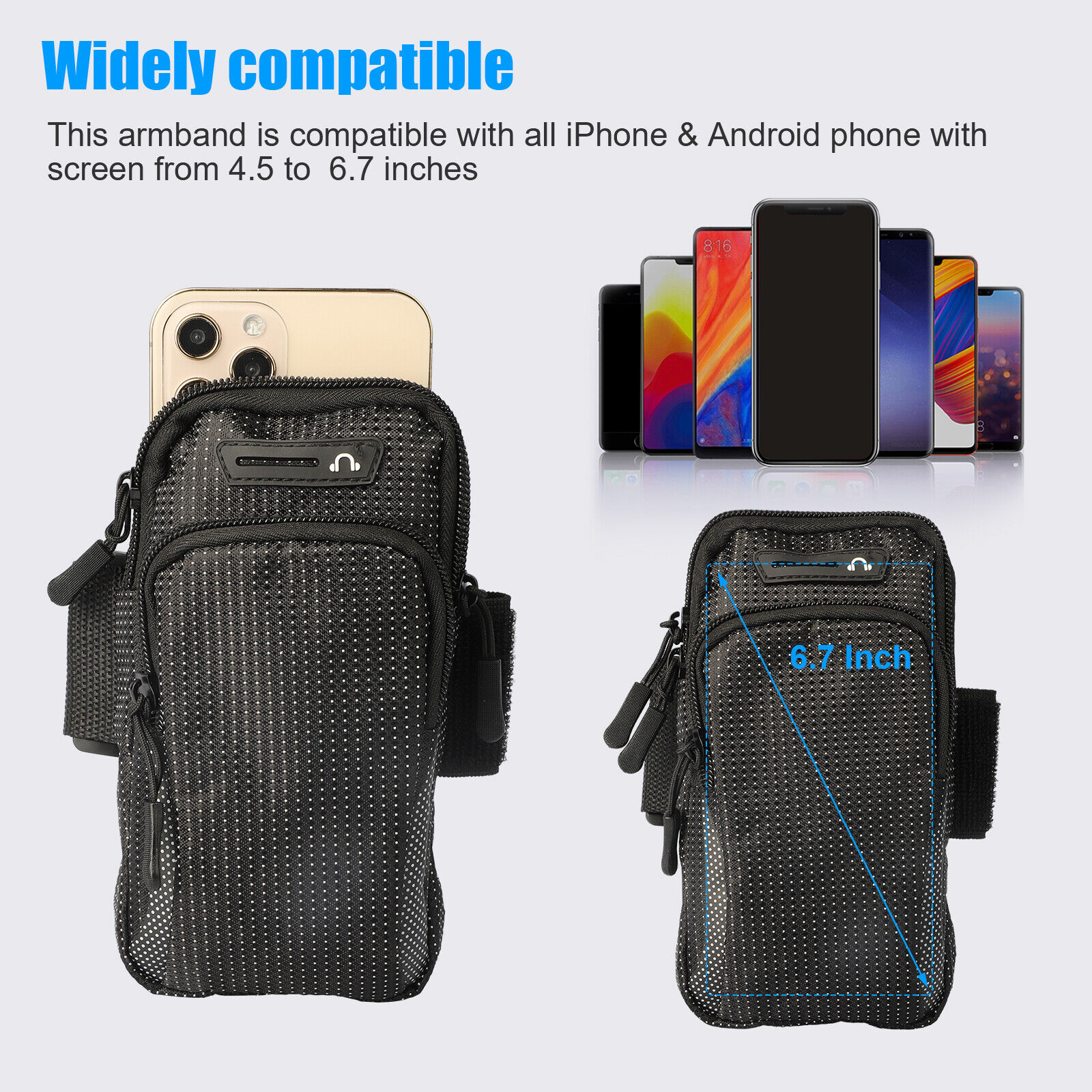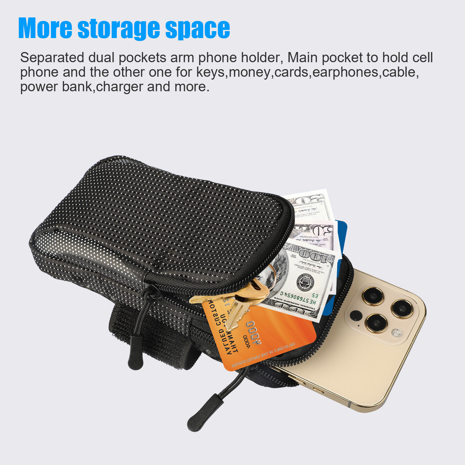 Getrennte Doppeltaschen Arm Telefonhalter, Haupttasche zu halten Handy und die andere für Schlüssel, Geld, Karten, Kopfhörer, Kabel, Powerbank, Ladegerät und mehr.