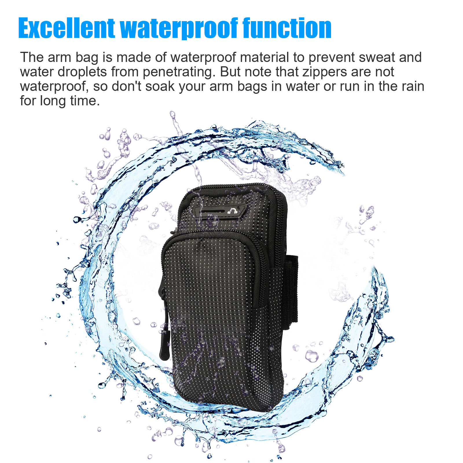 Die Armtasche ist aus wasserdichtem Material gefertigt, um das Eindringen von Schweiß und Wassertropfen zu verhindern. Beachten Sie jedoch, dass die Reißverschlüsse nicht wasserdicht sind. Weichen Sie Ihre Armtaschen also nicht in Wasser ein oder laufen Sie nicht lange im Regen.