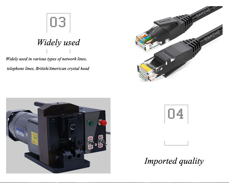 Crystal Head Crimping Machine Cable Wire Crimping Machine Crimping Pliers Terminal Machine 8P8C Network Cable Crimping Machine Phone Line Crimping Model No. Crystal Head Crimping Machine Product Stroke 25~30MM Power Supply AC220V 50/60HZ Product Weight Approx. 12KG Product Size 300*180*160MM Crimping Capacity 150KG Scope of application 2P2C4P4C6P6C8P8C10P10C British American and other types of crystal heads Product Description Each machine is configured according to customer product requirements of the knife mould, boot can be used!