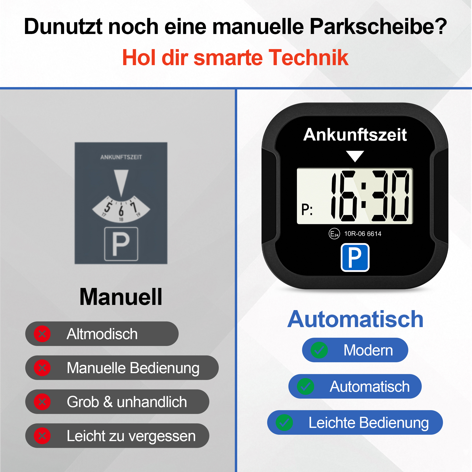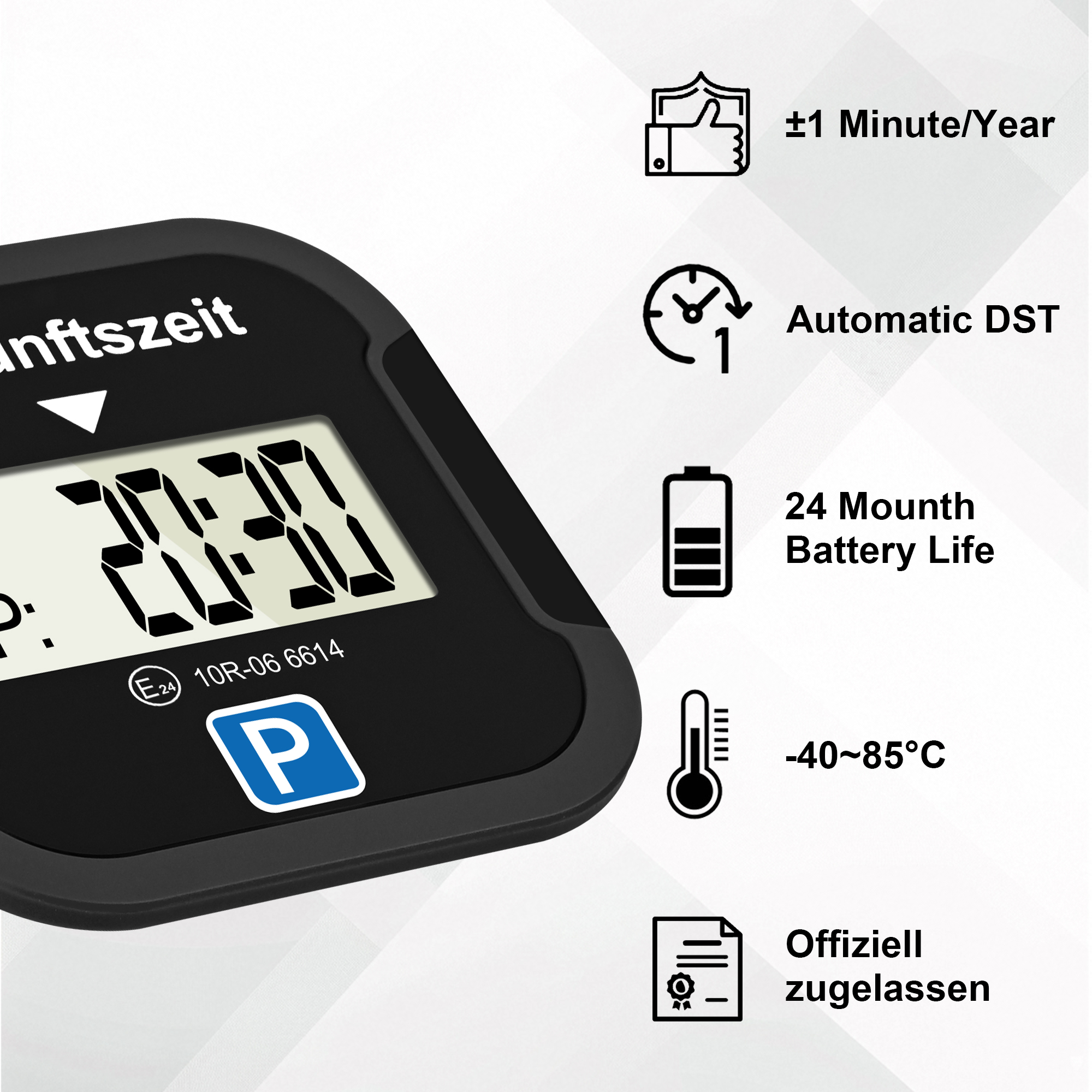 Elektronische Parkscheibe mit Zulassung fürs Auto - Automatische Digitale Parkscheibe Elektrisch mit Zulassung vom Kraftfahrt-Bundesamt nach StVO - Elektrische Parkuhr Auto zugelassen