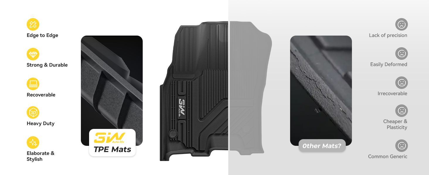 3W floor mats are made using injection molding, resulting in perfect patterns, deep grooves, and exclusive customized designs. They are manufactured using the highest standard production process, so there are significant differences compared to other brands. In addition, if the mat curls, boiling water can restore it to its original condition in seconds.