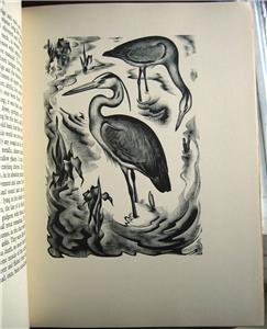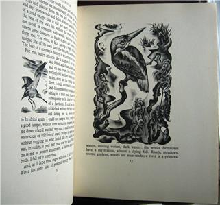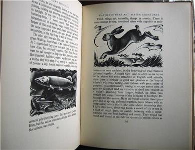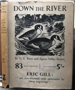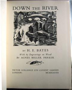 Down the River by H.E. Bates and Agnes Miller Parker, published 1937 by Victor Gollancz, London, 1st edition. 4to, approx 10 1/2" x 8" [23.5cm x 20.5cm], 151 pages, 83 wood engravings, some of them full page. Publisher's cloth, titles gilt to spine, original dust jacket.