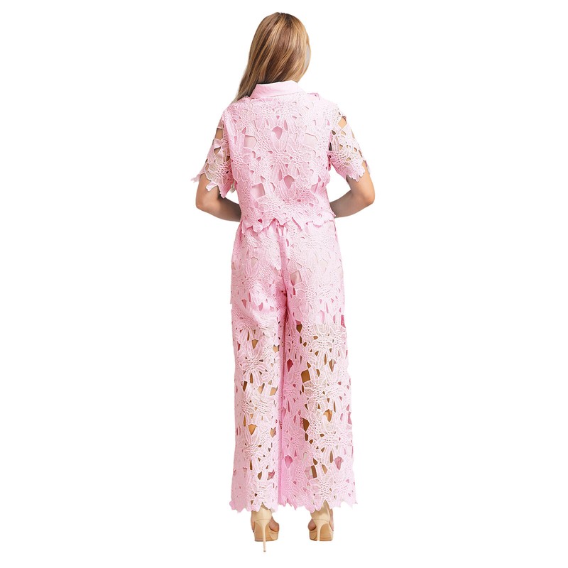 The solid-color tops with a lapel and short-sleeve design showcase a stylish and chic look, and the floral hollow-out element adds a touch of femininity and elegance.