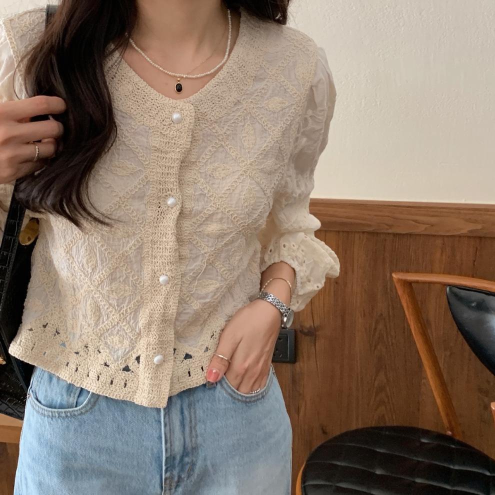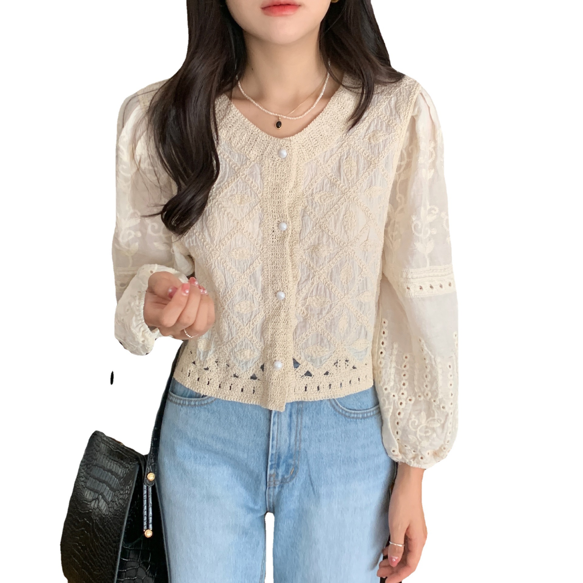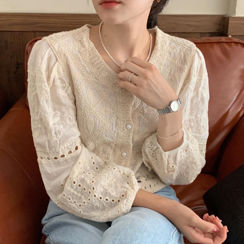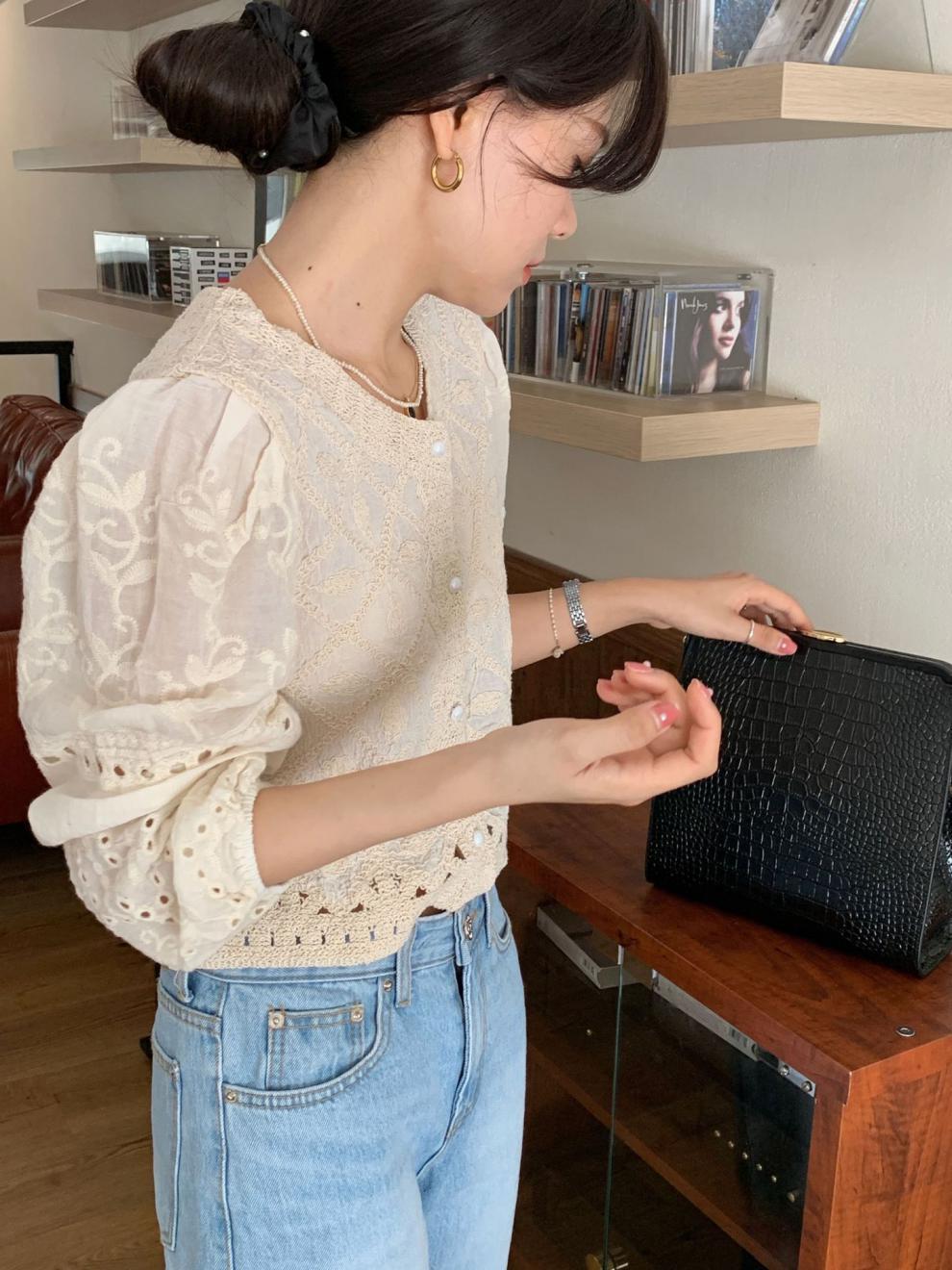 V-neck Embroidered Hollow Shirt Loose Cotton and Linen Bubble Sleeves, Short Top