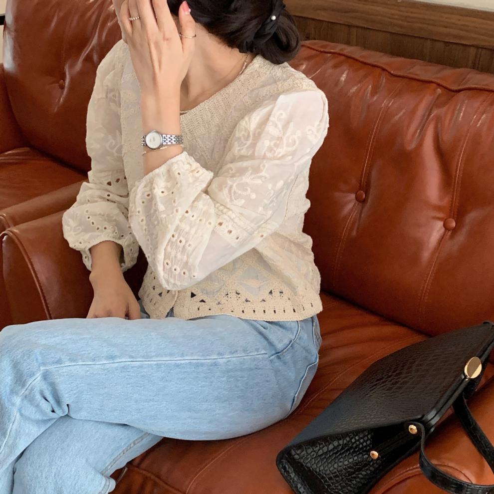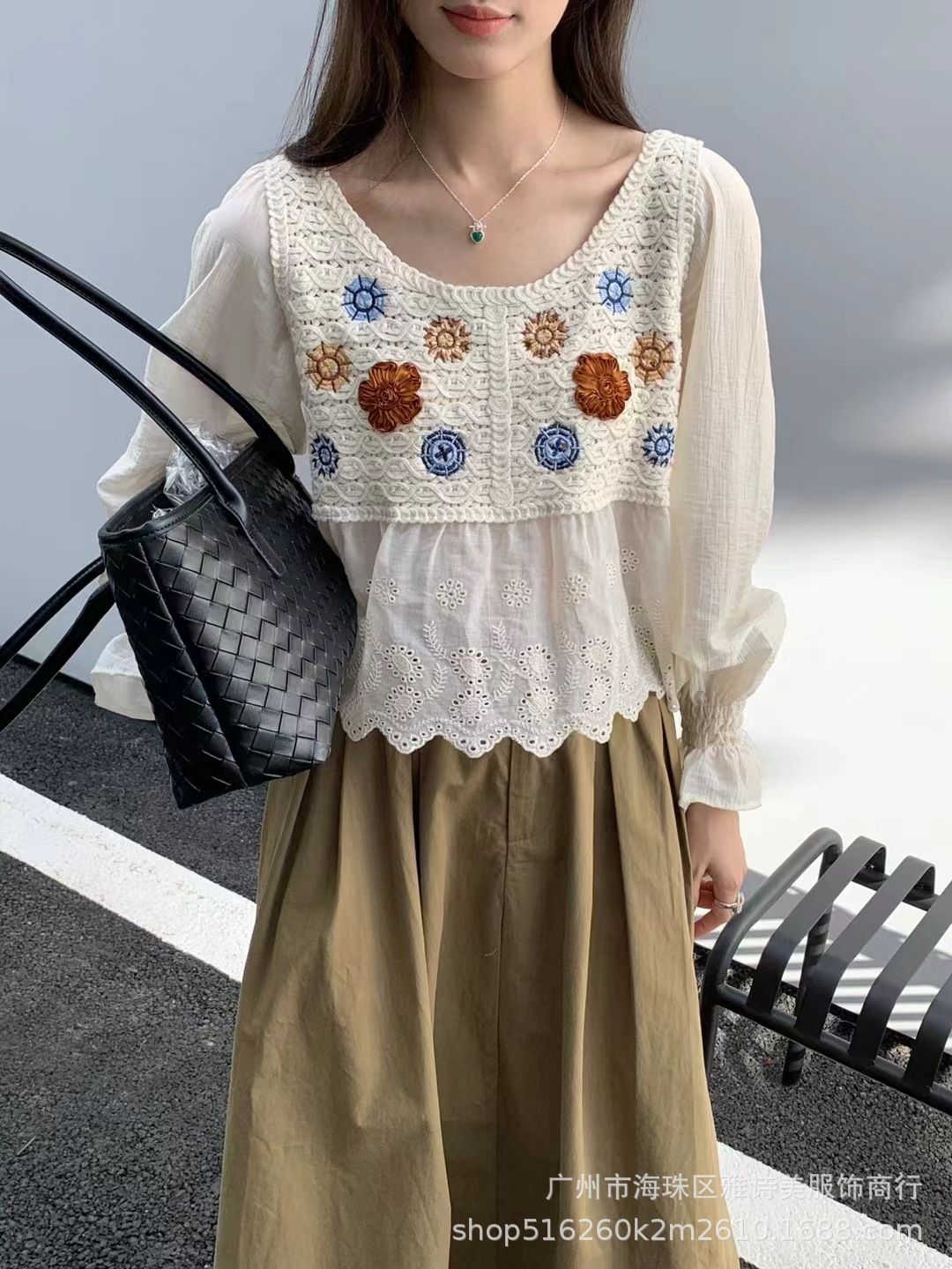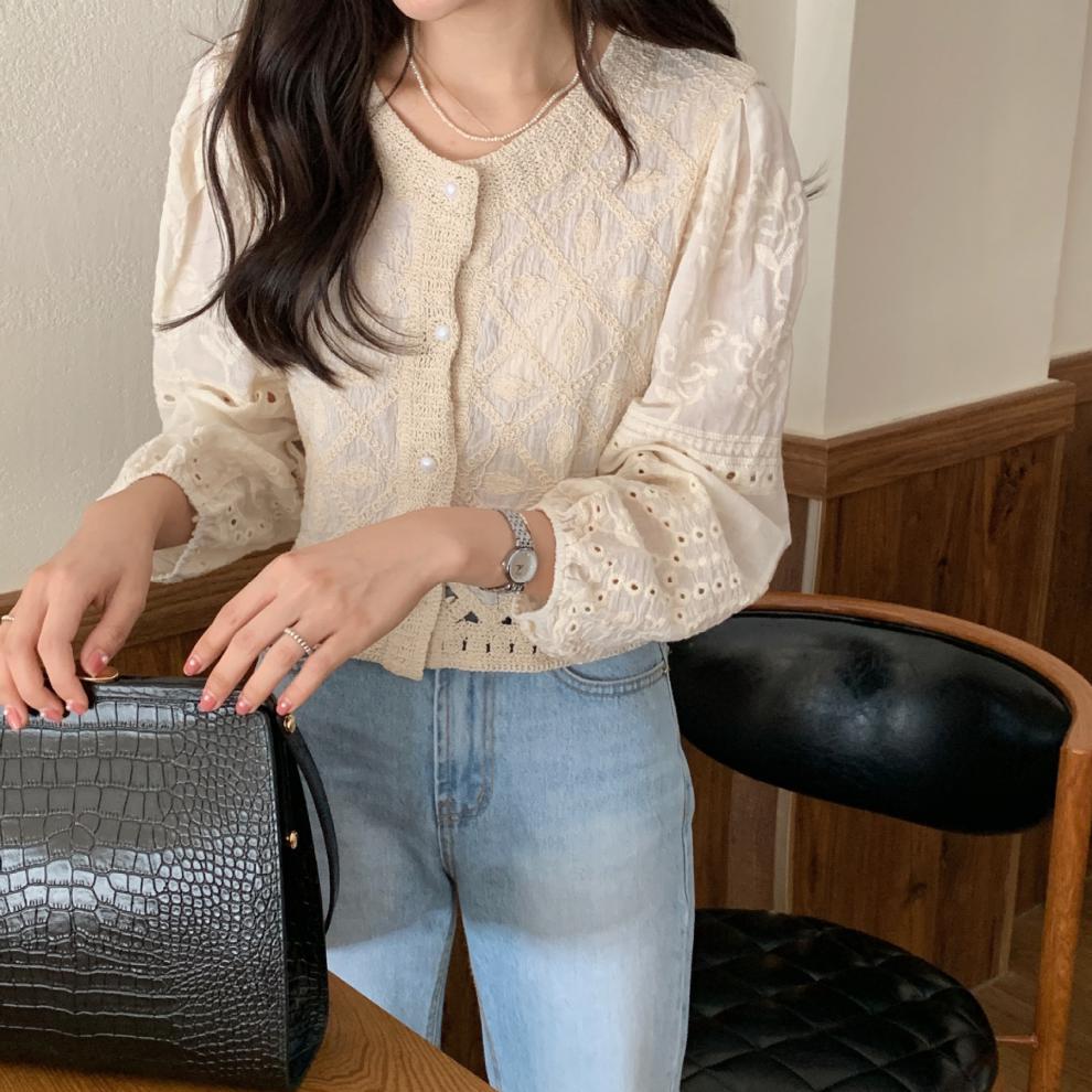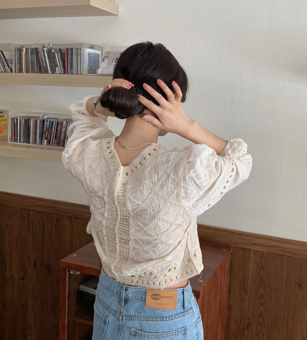 V-neck Embroidered Hollow Shirt Loose Cotton and Linen Bubble Sleeves, Short Top