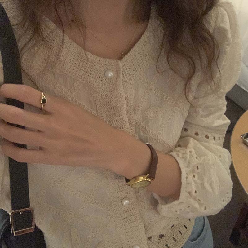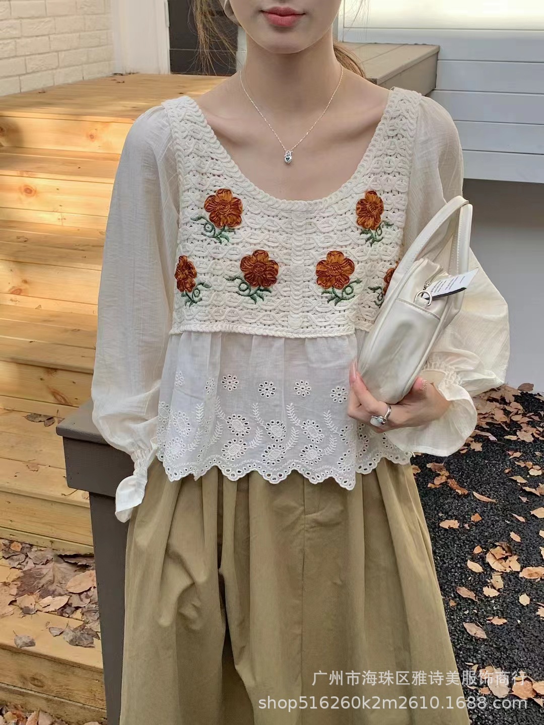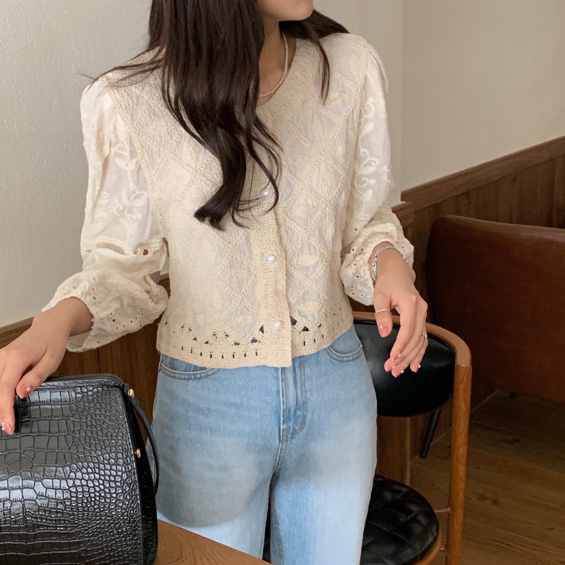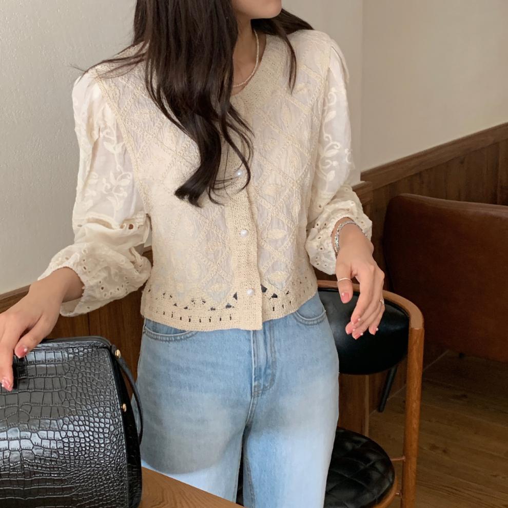 V-neck Embroidered Hollow Shirt Loose Cotton and Linen Bubble Sleeves, Short Top