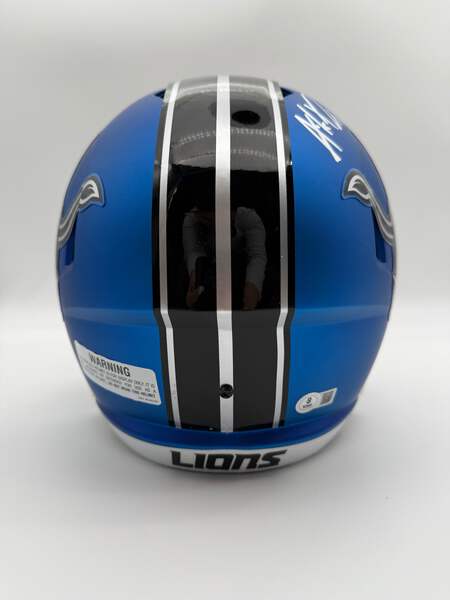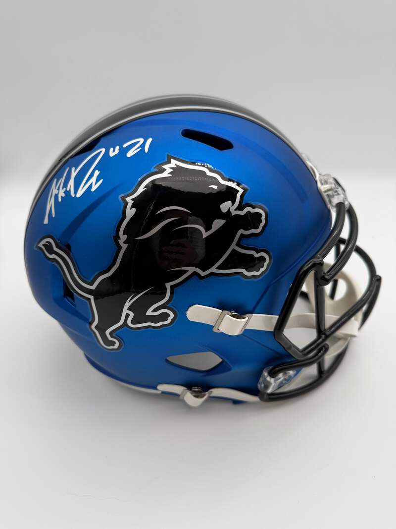 Showcase your love for Detroit Lions with this autographed full-size speed Alternate replica helmet of Amik Robertson. This helmet is perfect for any football fan and comes with a Beckett Authentication Services (BAS) seal of approval. The helmet features the number 21 and the player's signature, making it a must-have for any true collector.