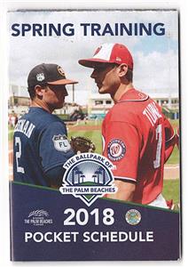 Here's a 2018 Spring Training pocket schedule for the Washington Nationals and Houston Astros. They shared the Ballpark of the Palm Beaches in West Palm Beach, Florida. The Nationals Trea Turner and Astros Alex Bregman appear on the cover. Excellent shape.