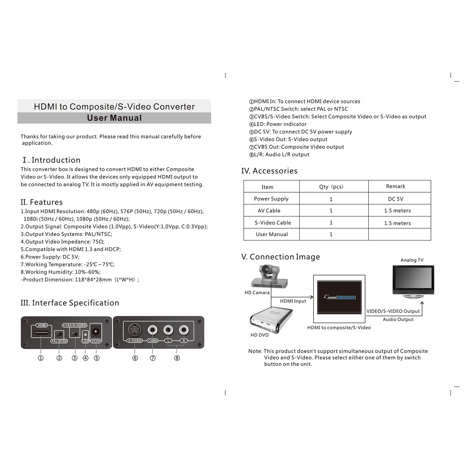 9. HDMI to S-video Converter: Convert HDMI signal to S-video analog video and L / R audio.