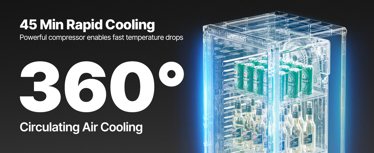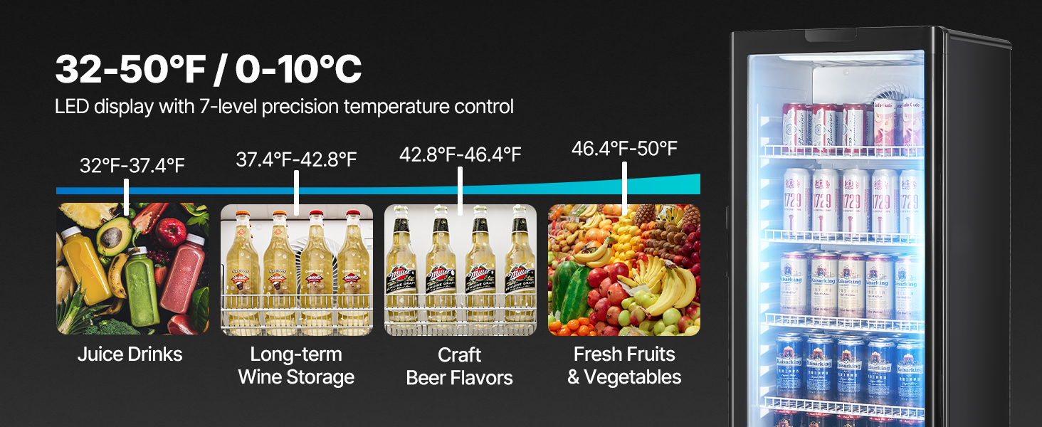 - Fast Cooling: Our display refrigerator upright fridge cooler boasts a powerful compressor and 7-level temperature control (32ºF-50ºF / 0℃-10℃). With an air cooling system, it ensures uniform cooling, chilling your drinks in 45 minutes