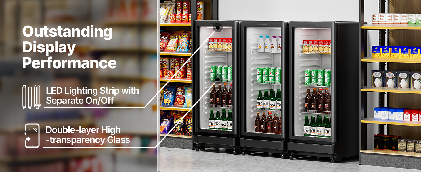 - Exceptional Display Performance: Our commercial merchandiser refrigerator delivers double-layer high-transparency glass that keeps out external heat while letting you see the inside without opening the door. Plus, the LED lighting with an independent switch creates an eye-catching lighting experience, showcasing your beverages beautifully. Note: Please let the unit rest for at least 6 hours and then power on after receiving it