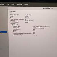 2022 Apple MacBook Air 13.6" M2 8C GPU 3.5GHz 8GB RAM 256GB SSD A2681 Items included in this sale: 2022 Apple MacBook Air 13.6" M2 8C GPU 3.5GHz 8GB RAM 256GB SSD A2681 No Charger *Please note, if it is not listed it is not included - such as power cables or other accessories. Specifications: Collection Apple Computers Sub-Collection Apple MacBook (M-Chip Only) Brand Apple Model MacBook Air MPN A2681 Release Year 2022 Processor Brand Apple Processor M2 Processor Cores 8C CPU Processor Speed 3.5GHz GPU (Cores) or Graphics Card 8C GPU Memory (Ram) 8GB RAM Storage 256GB Storage Type SSD Screen Size 13.6" Display Liquid Retina Resolution 2560 x 1664 Retina Yes Touch Bar/Fingerprint Sensor No/Yes Bluetooth Yes Webcam Yes Microphone Yes WiFi Yes Color Midnight Has Limited Warranty? No Apple Limited Warranty Has AppleCare+? No AppleCare+ Condition Fair Operating System Sequoia 15.3.2 Connections 2x Thunderbolt 4 (USB-C) Port MagSafe 3 3.5mm Audio Jack Cycle Count 301 Battery Condition Normal Maximum Battery Capacity 91% UPC 195949900372 Serial# G72JLYD7QC Password password Cosmetic condition: The top case is in fair condition due to light scratches and scuffs. Some of these scratches are semi-deep and easily seen. The bottom is in fair condition due to scuffs, and scratches and wear. Some of these scratches are semi-deep and easily seen. The sides are in fair condition due to some deep scratches, a large dent in the front and wear. All of the ports are in good condition and clean. The screen is in good condition, there is a small very minor mark on the screen. The keyboard is in good condition with some minor wear and signs of use. The hinges are in good condition, sturdy and functioning properly. The bezel is in good cosmetic condition with little to no wear. Please view our close up photos, as these are taken of the actual item being offered for sale. Functionality condition: The LCD is fully functional with no damage or issues. I was able to connect to a WiFi network and test the audio by playing a video. The WiFi and audio are both fully functional. The keyboard has been tested and all keys function properly.