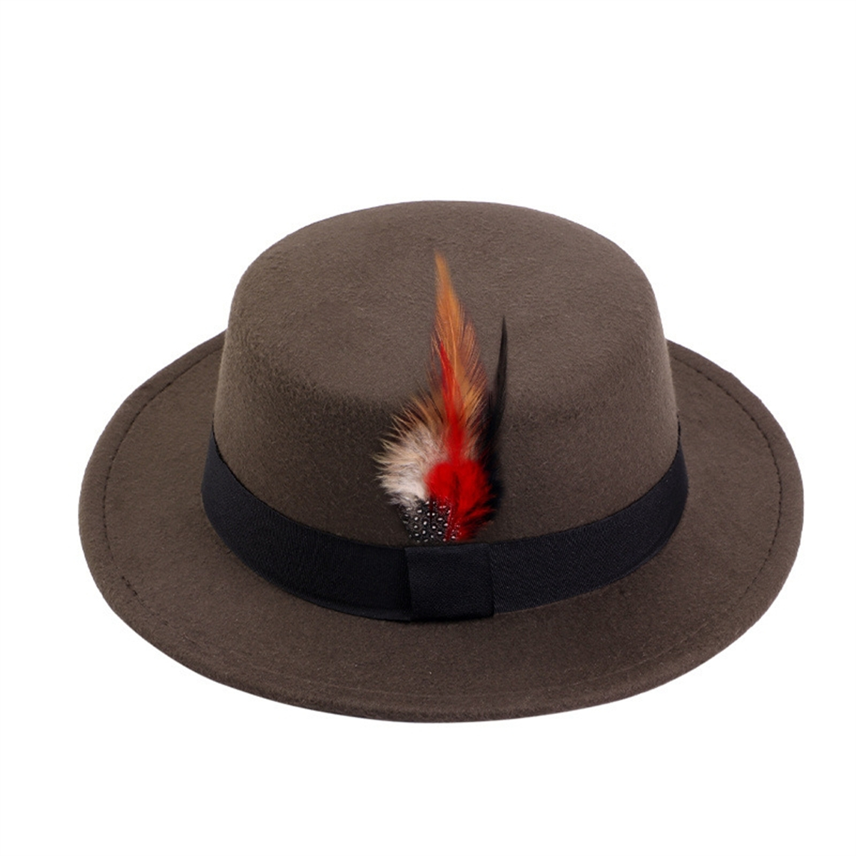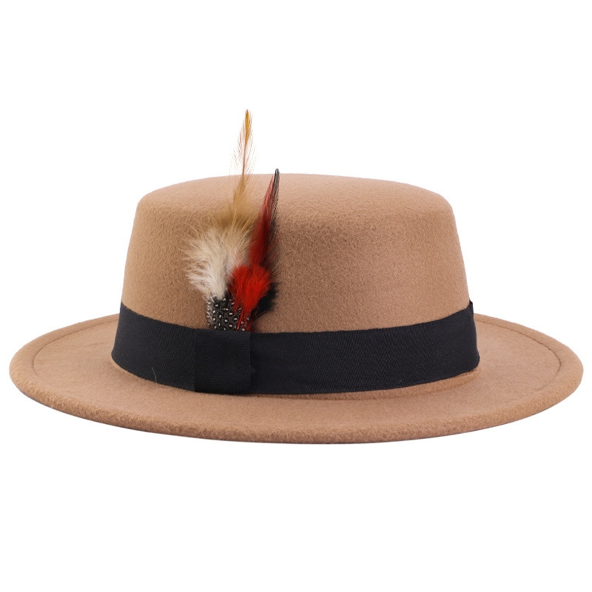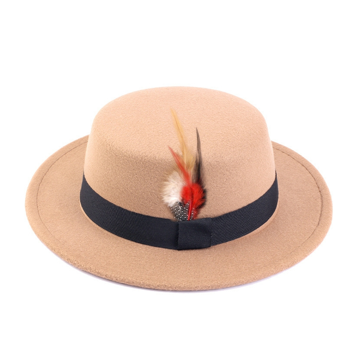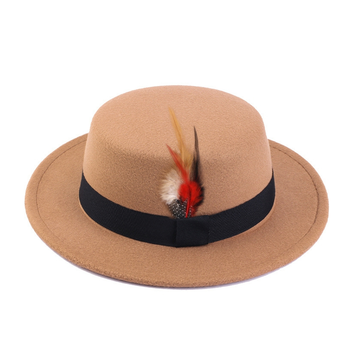 Men Women Porkpie Woolen Flat Top Hat Retro Feather Jazz Hat Gentleman's Hat