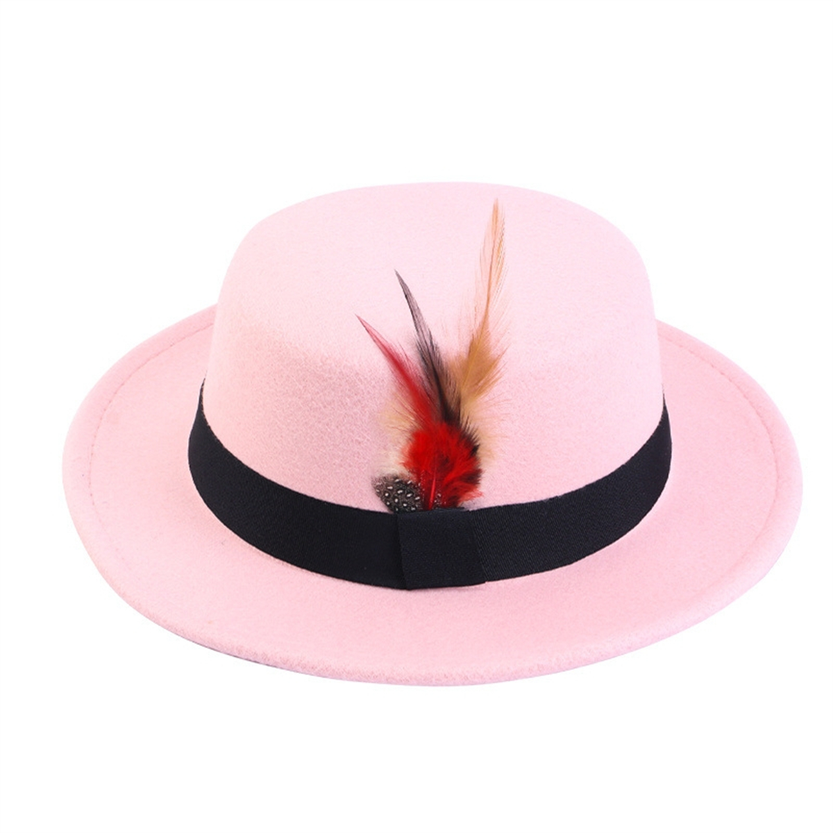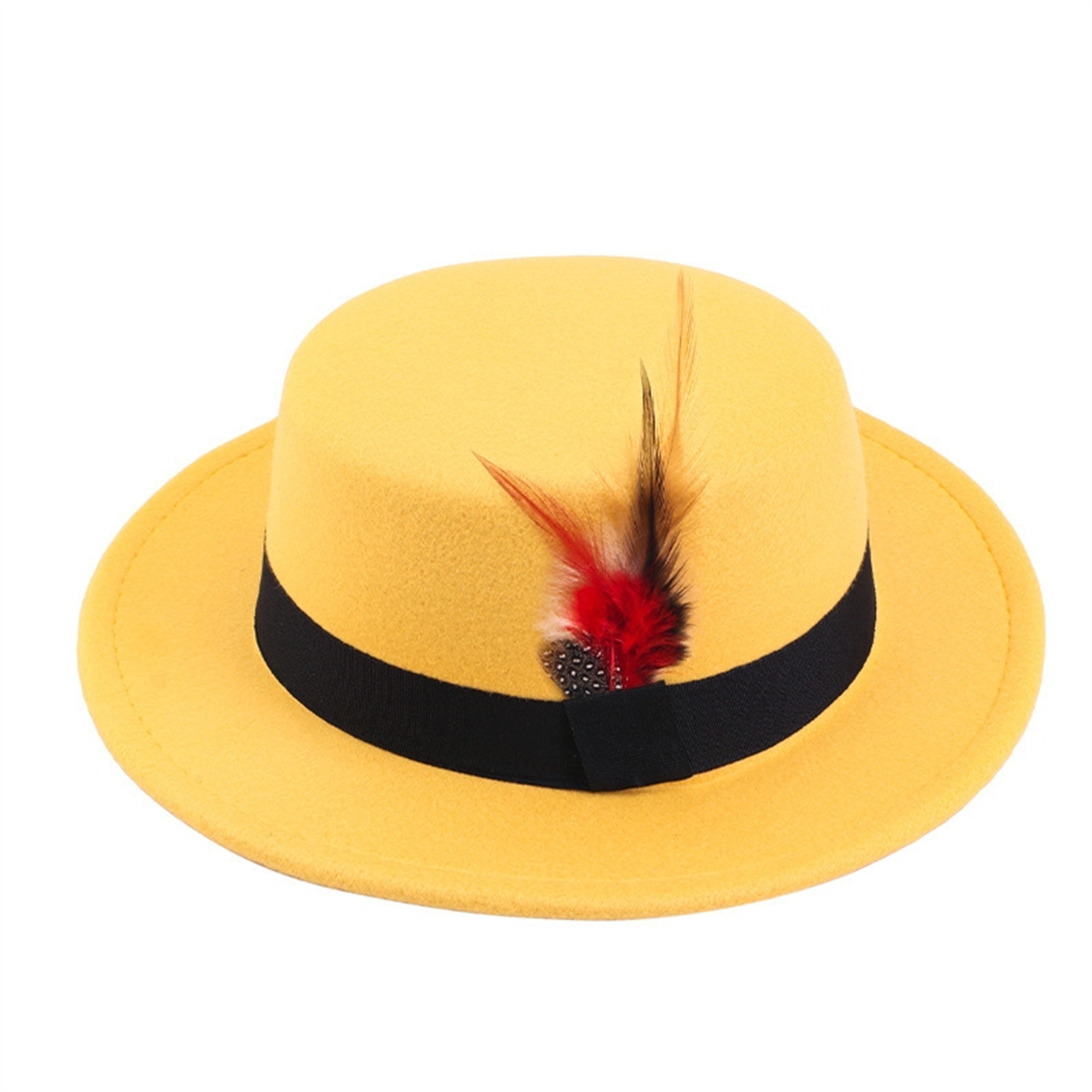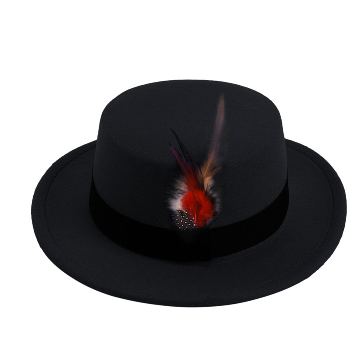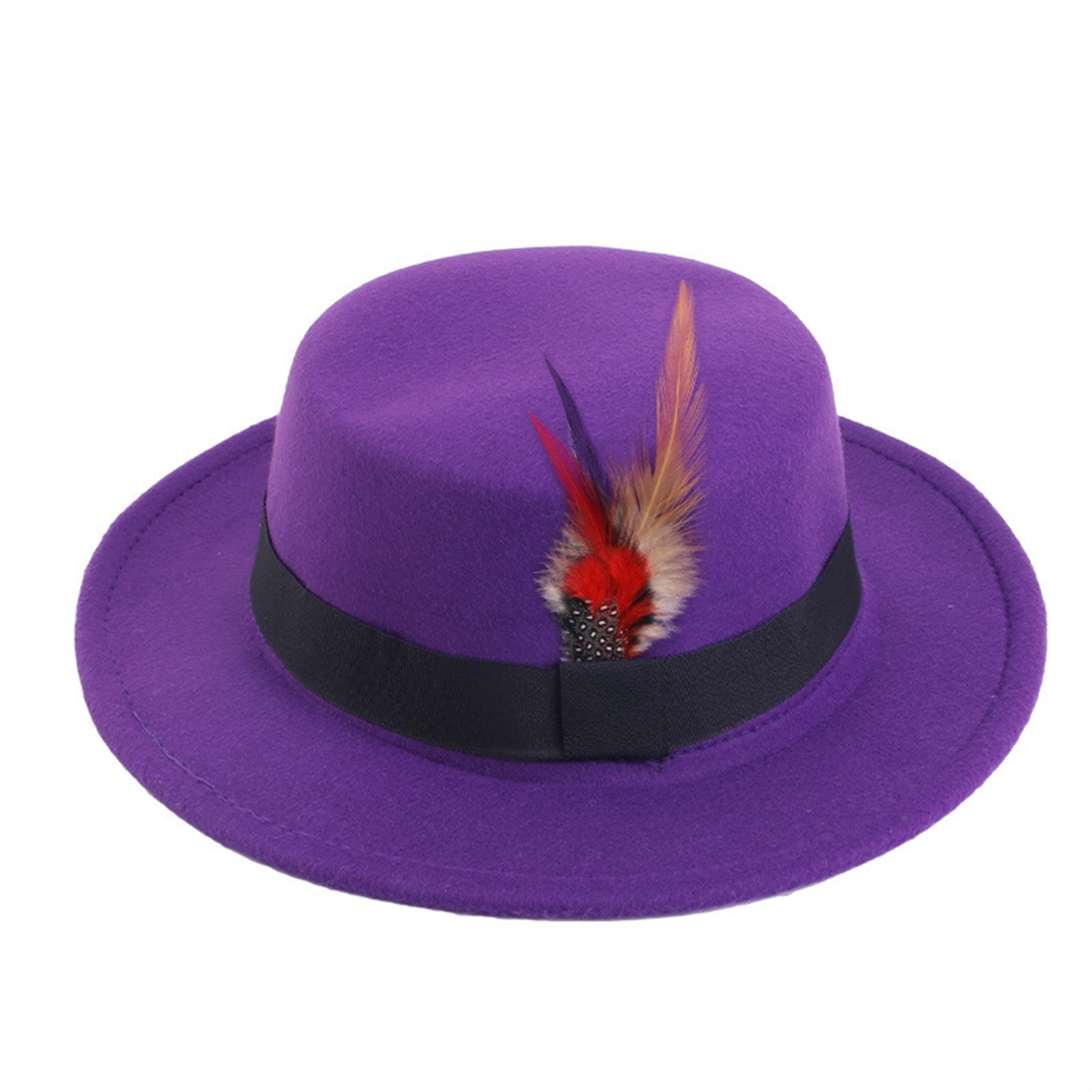 Men Women Porkpie Woolen Flat Top Hat Retro Feather Jazz Hat Gentleman's Hat