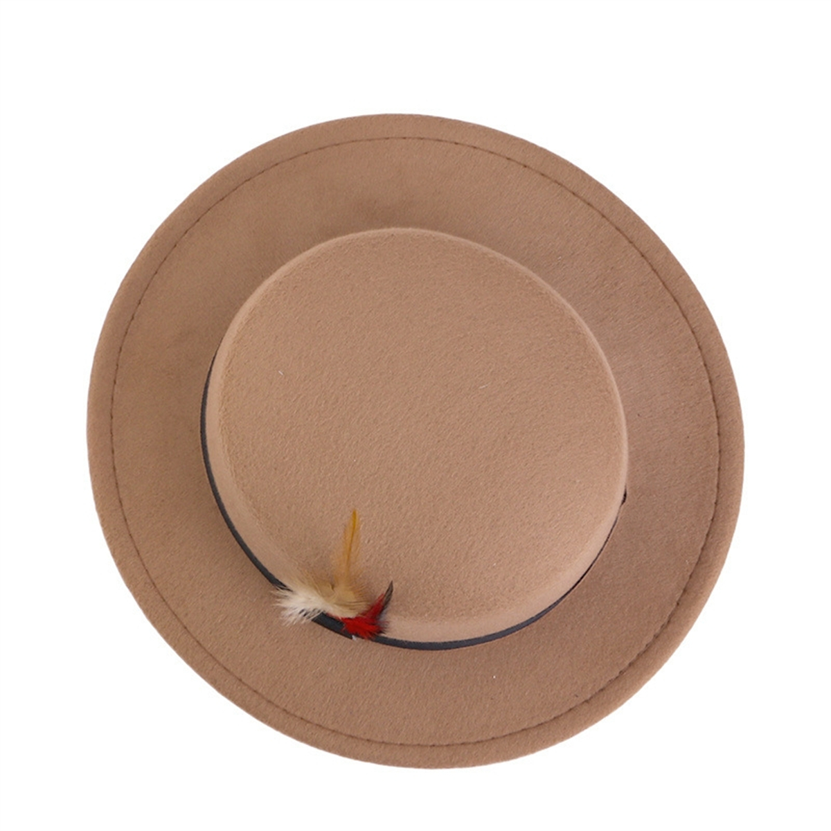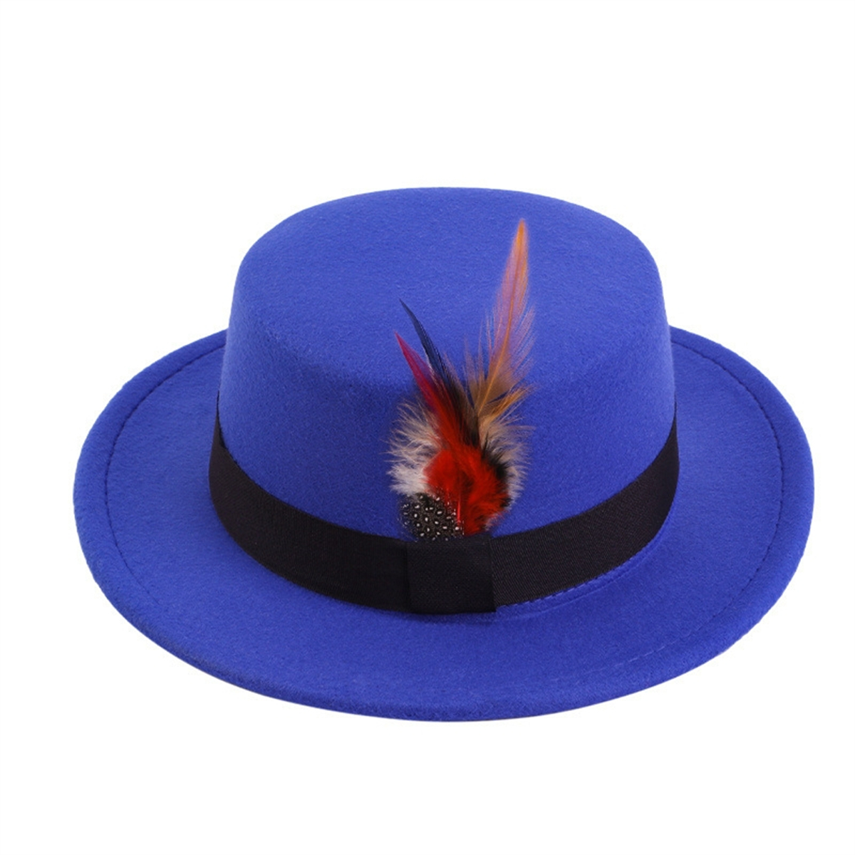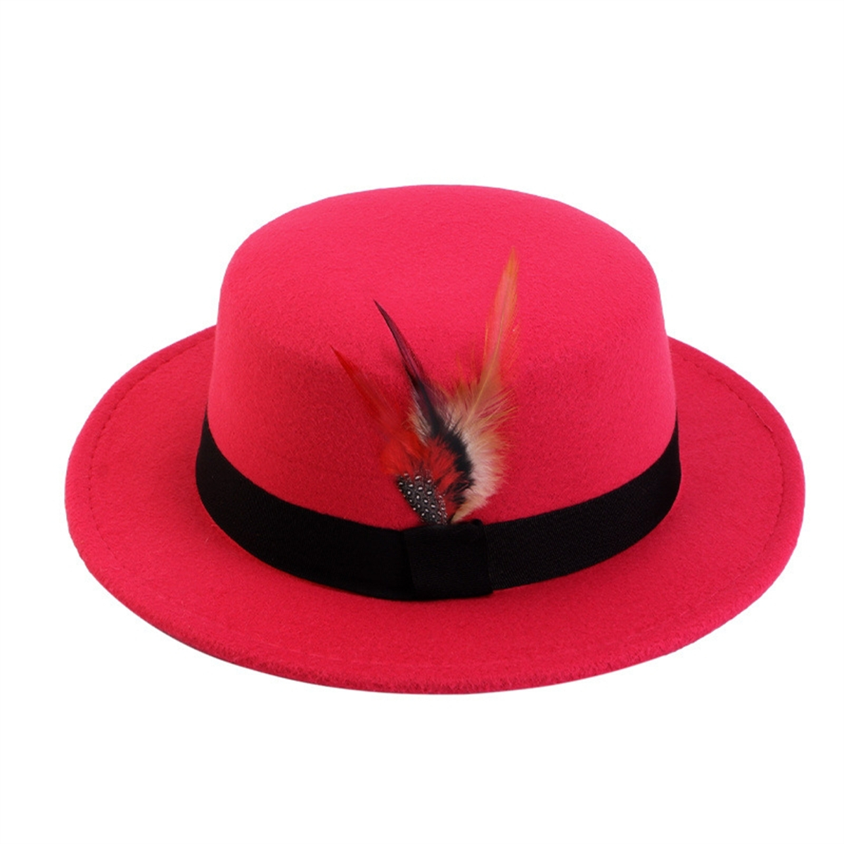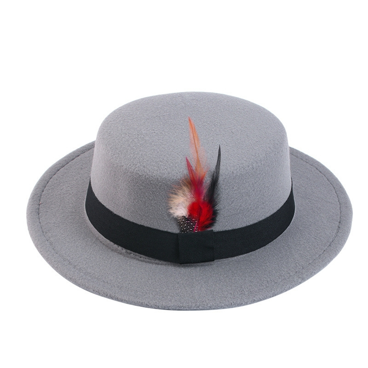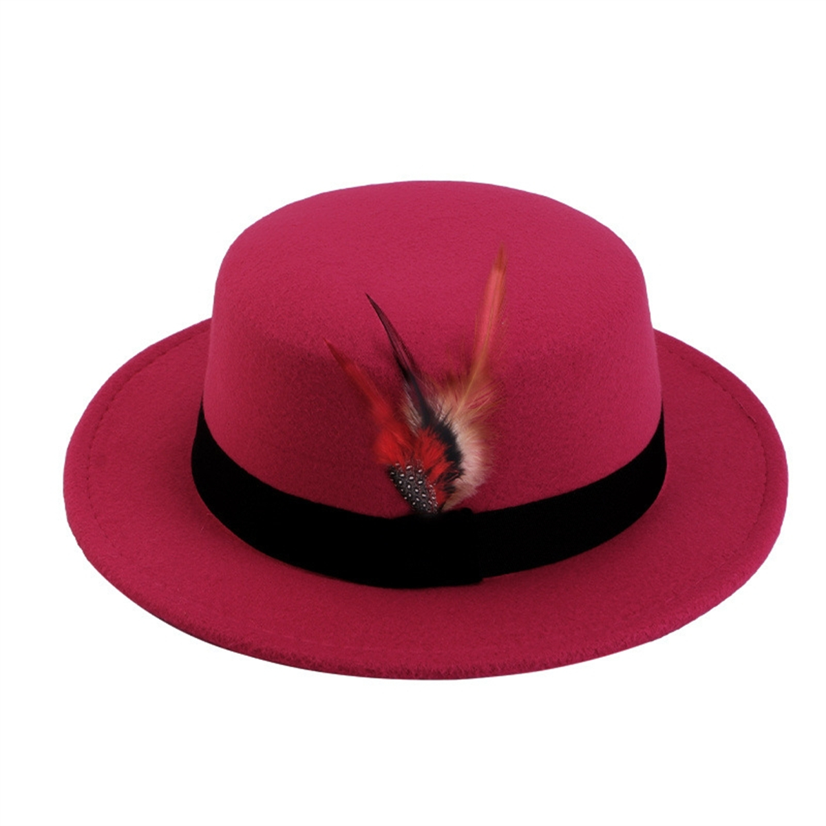 Men Women Porkpie Woolen Flat Top Hat Retro Feather Jazz Hat Gentleman's Hat