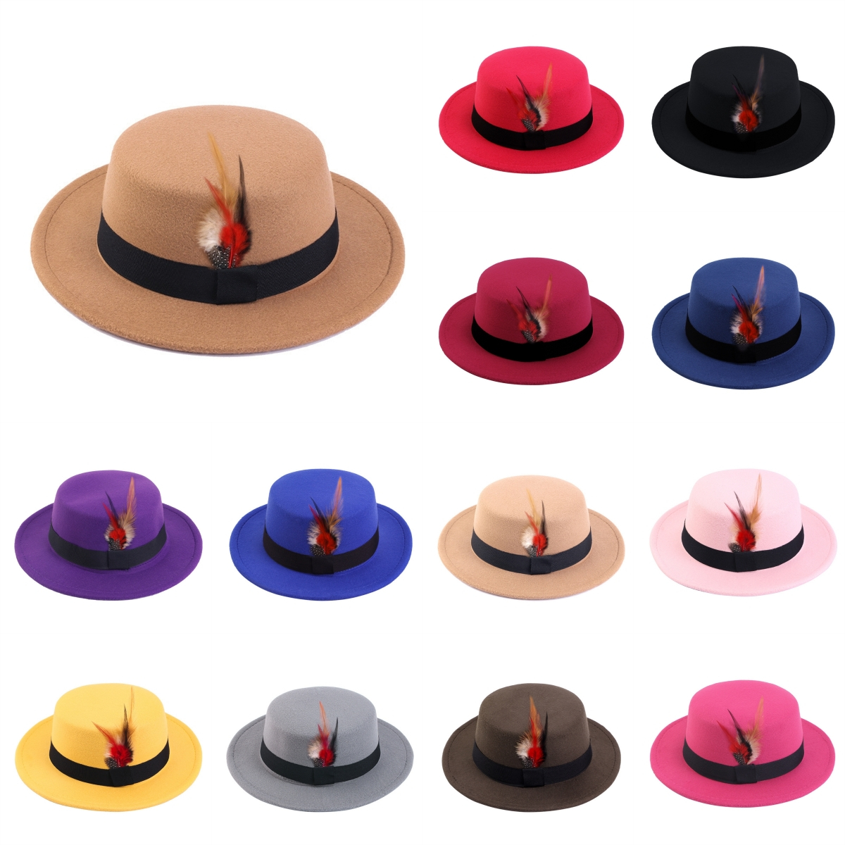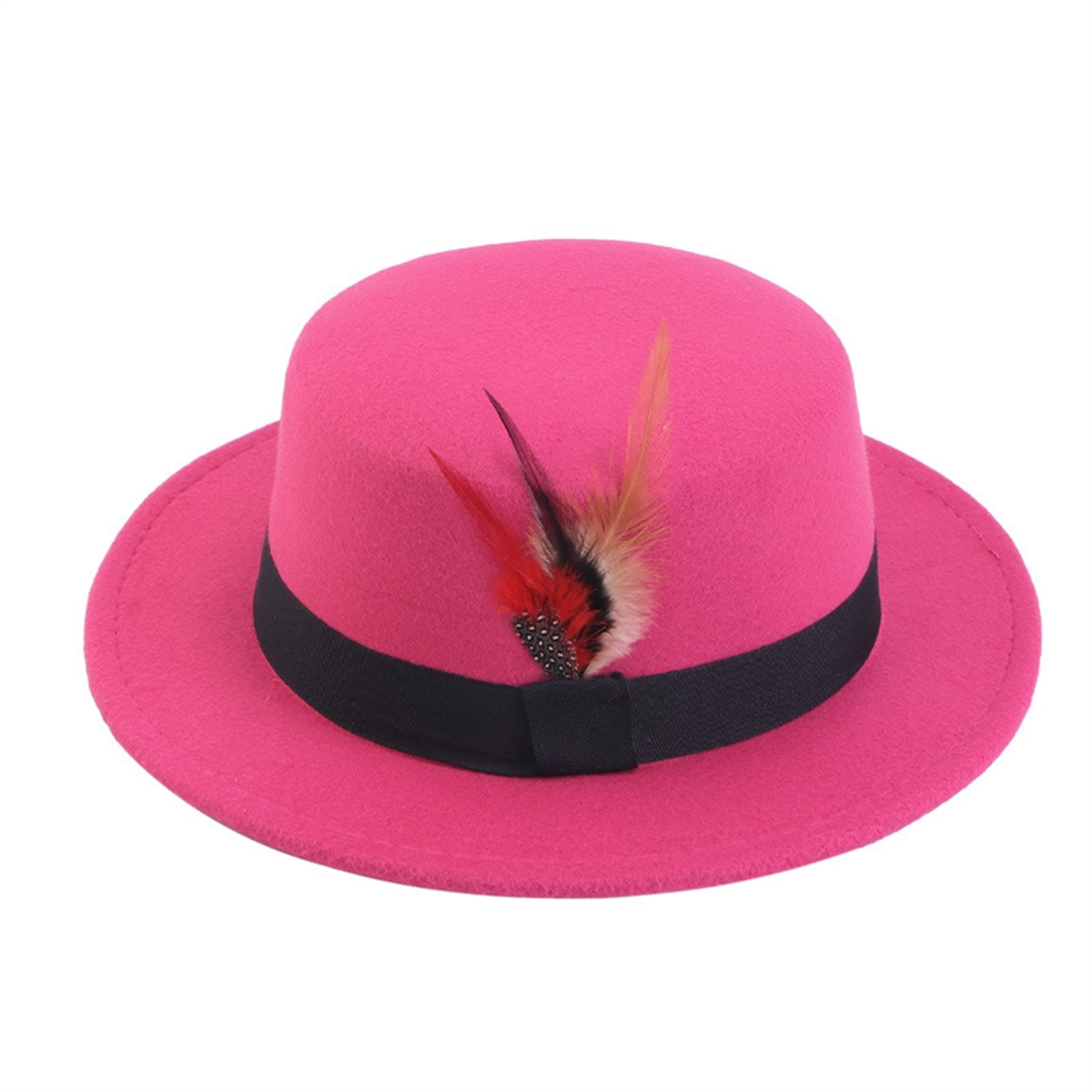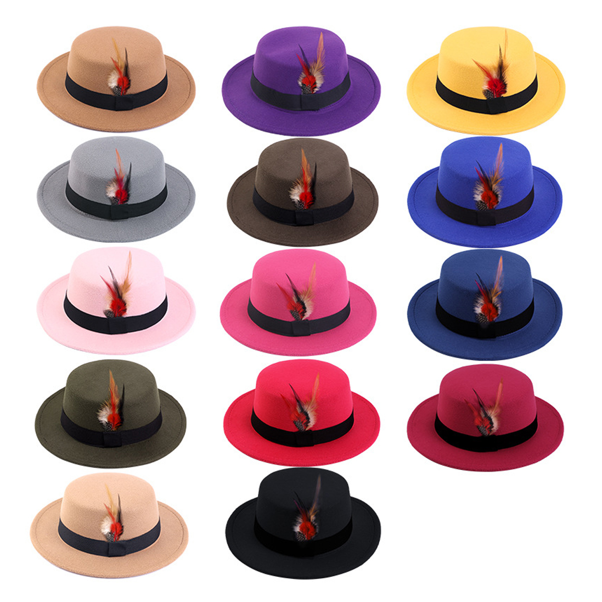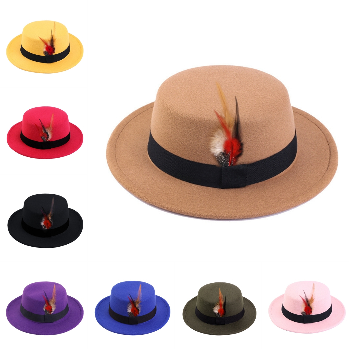 Men Women Porkpie Woolen Flat Top Hat Retro Feather Jazz Hat Gentleman's Hat
