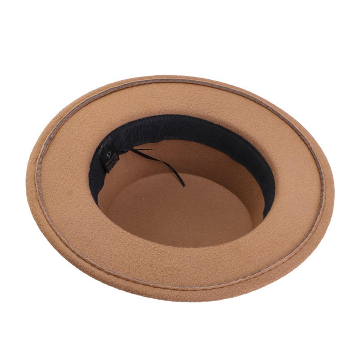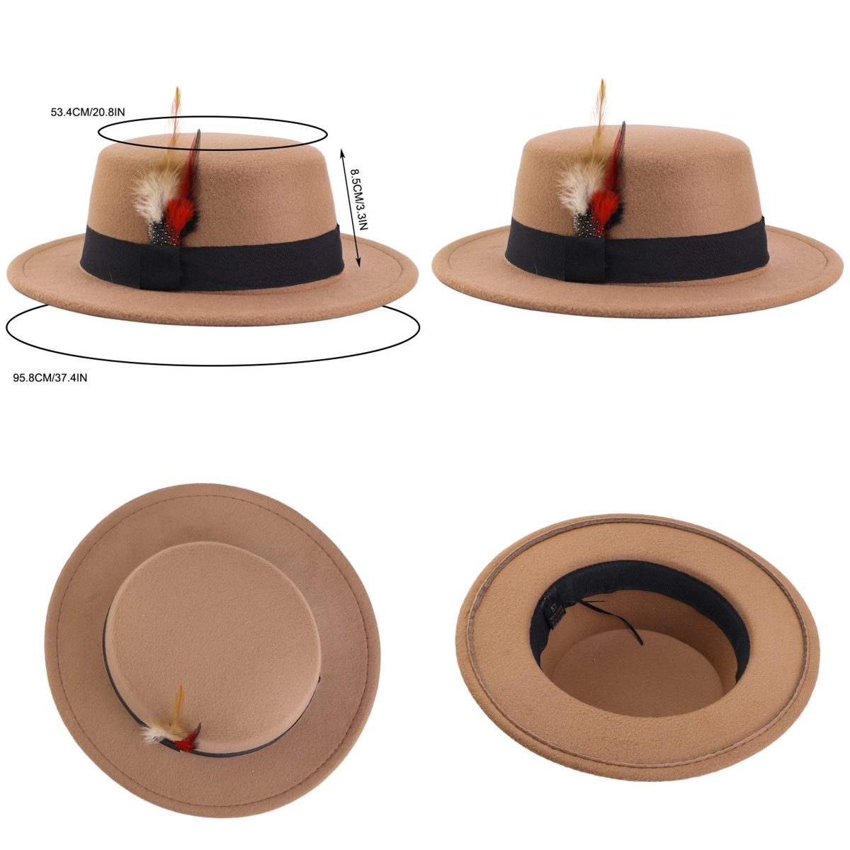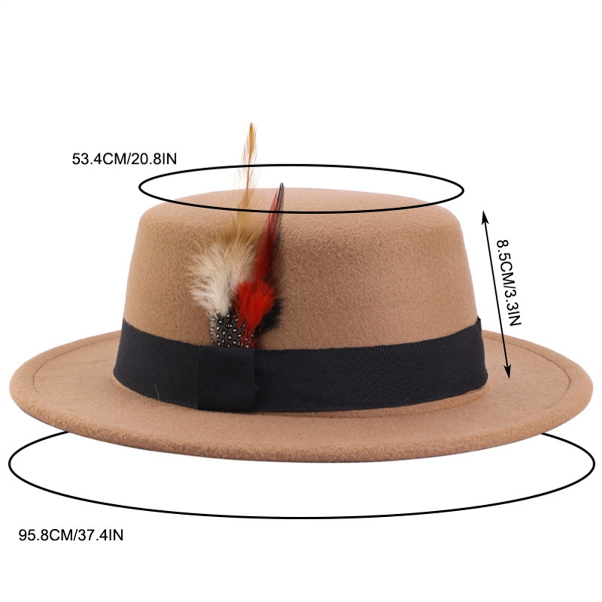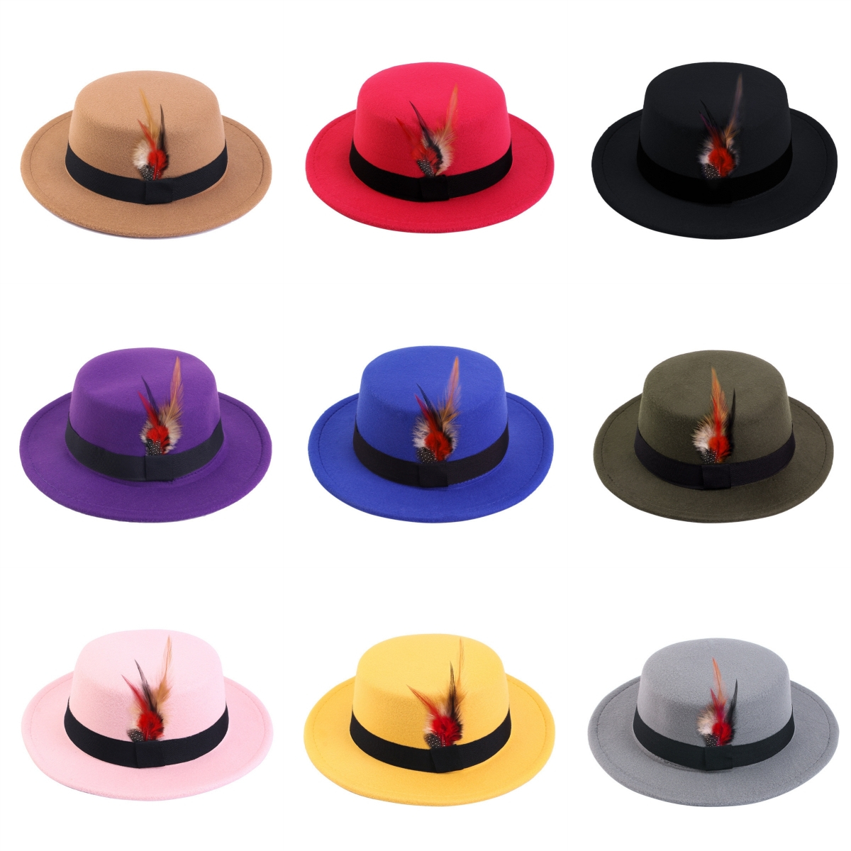 Men Women Porkpie Woolen Flat Top Hat Retro Feather Jazz Hat Gentleman's Hat