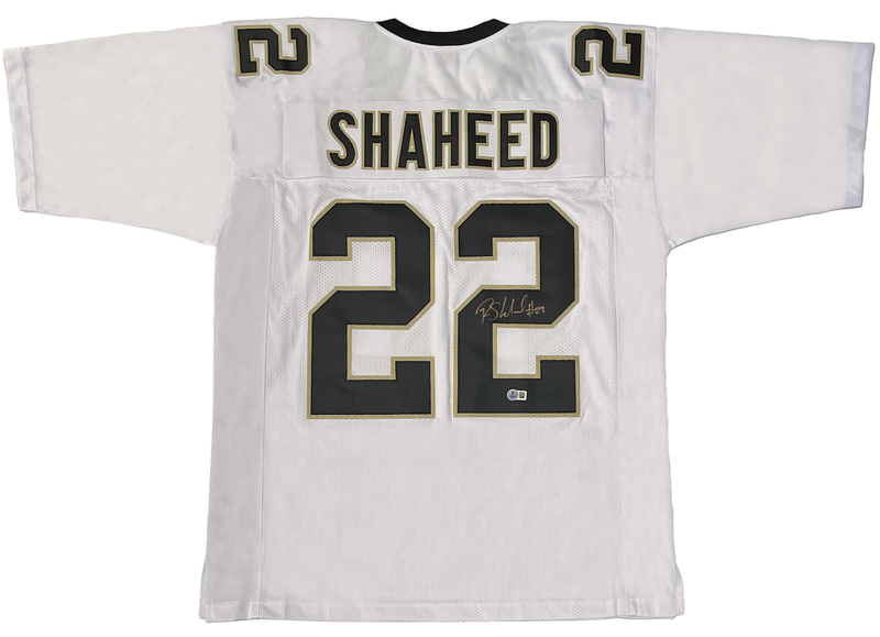 This custom white jersey has been hand signed by Rashid Shaheed, wide receiver for the New Orleans Saints. It comes with an individually numbered, tamper-evident hologram from Beckett Authentic. To ensure authenticity, the hologram can be reviewed online. This process helps to ensure that the product purchased is authentic and eliminates any possibility of duplication or fraud.Rashid Shaheed is the newest exclusive athlete to the Game Day Legends family.