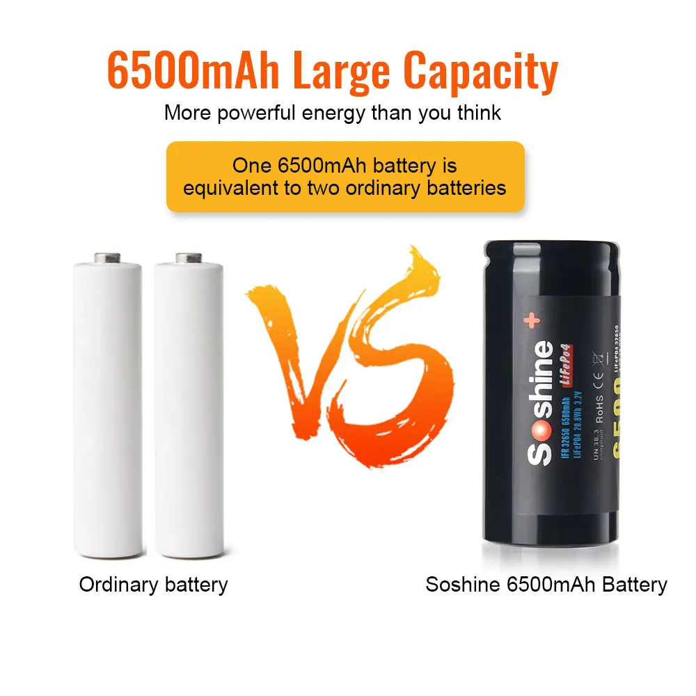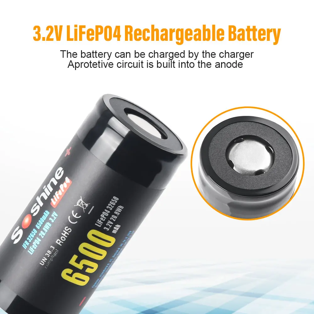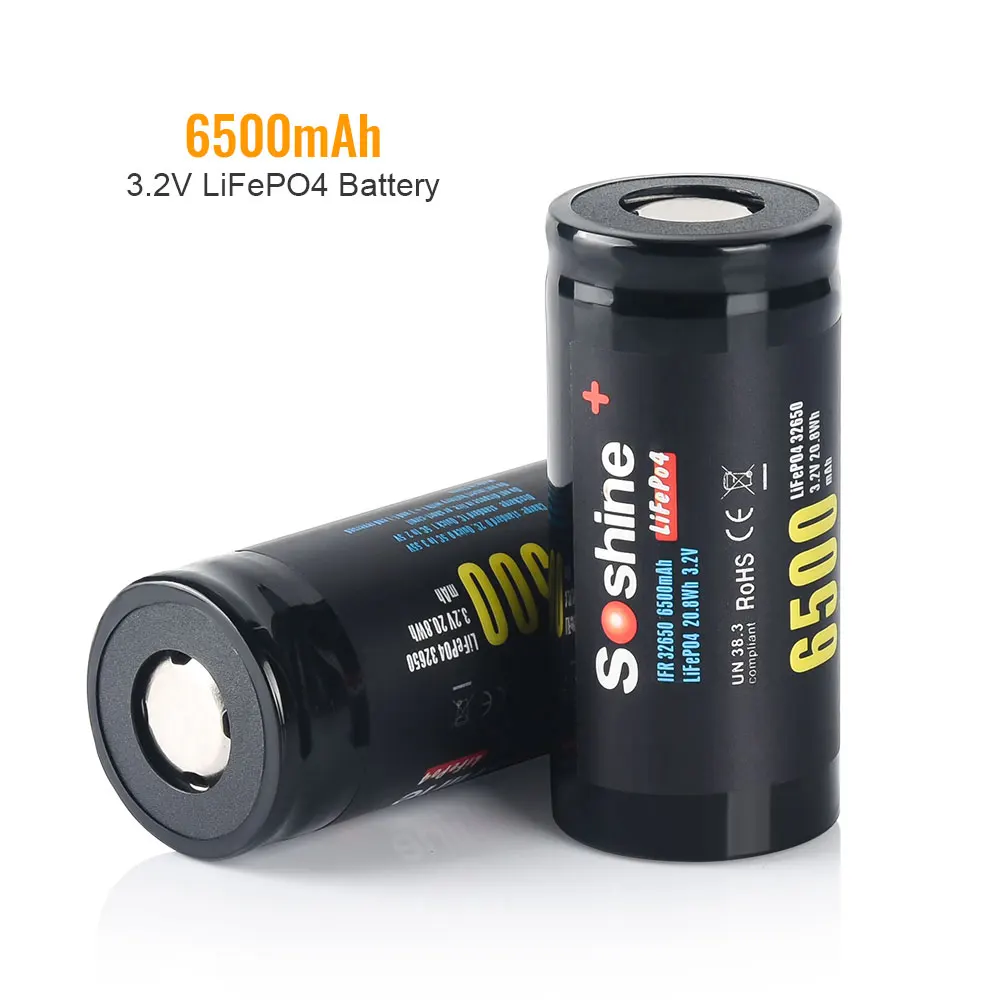 Soshine 32650 LiFePO4 Battery 3.2V 6500mAh Rechargeable Battery 2000 Discharge Cycle 100% Original 3.2V 32650 6500mAh Batteries