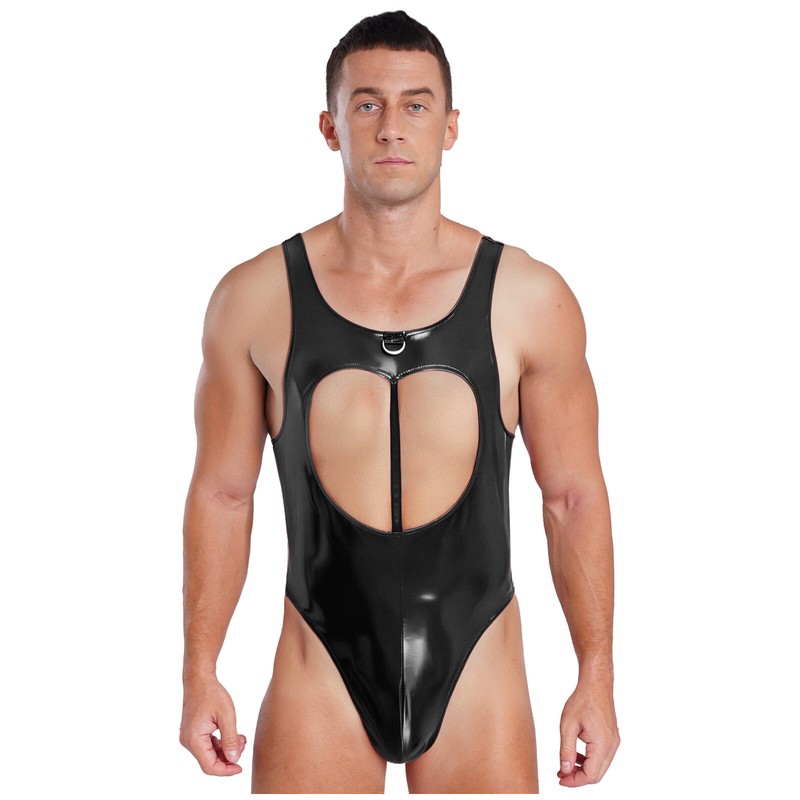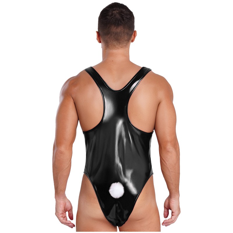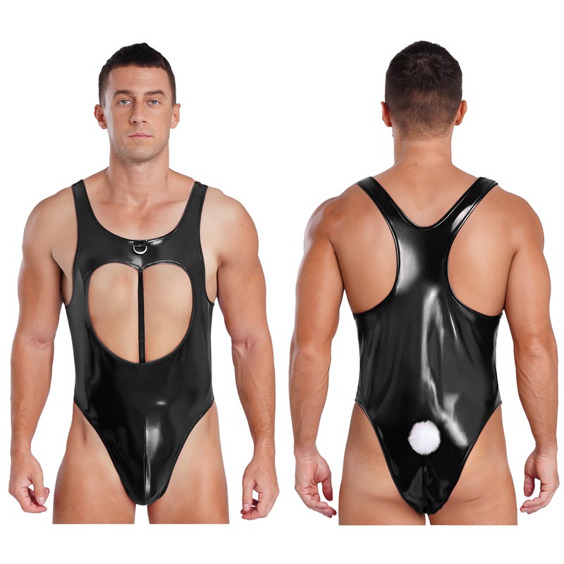 Men Shiny Leather Sleeveless Bodysuit with Heart Shaped Cutout Bunny Rabbit Tail