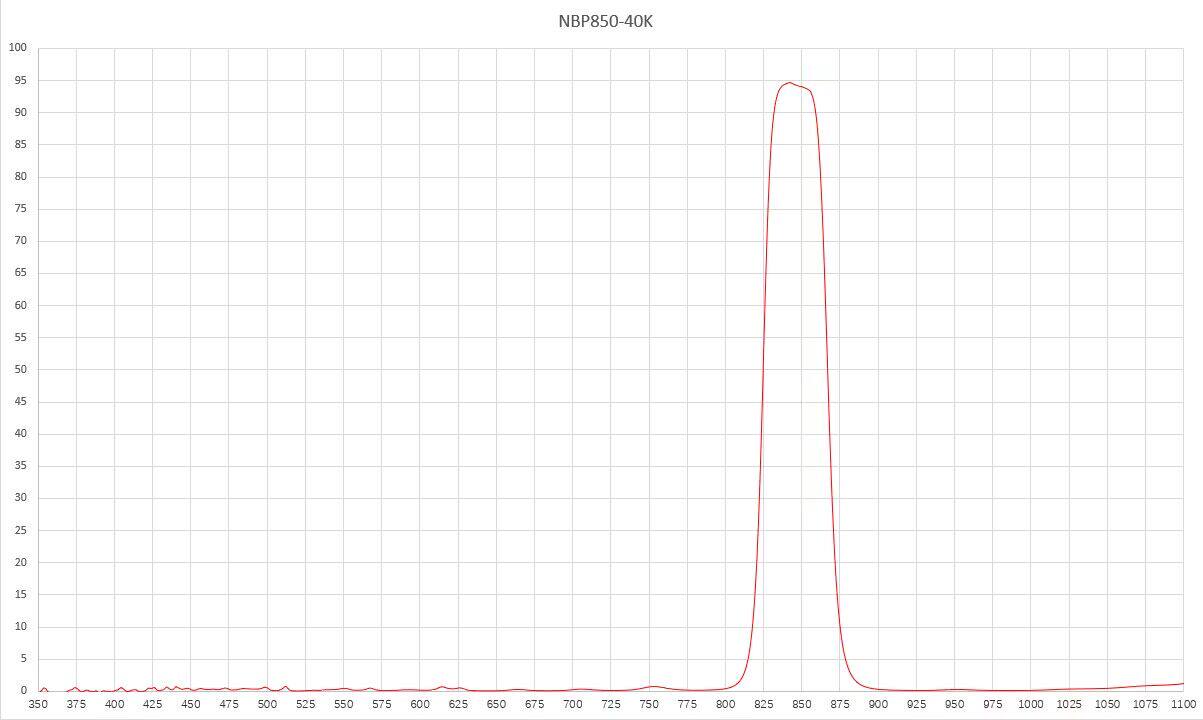 Product Name: 850 Narrow Band Filter Model: NBP850 Central Wavelength: 850nm Bandwidth: 40 - 50nm Peak Transmittance: >90% Cut - off Depth: Tave < 0.5% Reference Spectrum as Follows: