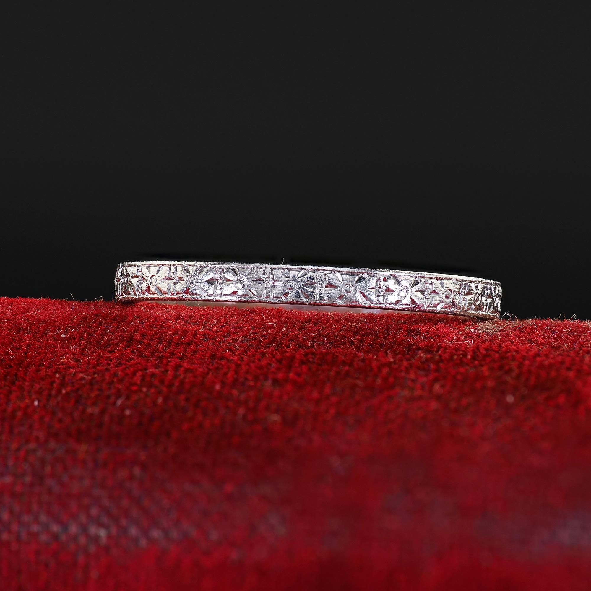 Beautiful Antique Platinum J. R. Wood and Sons Engraved Wedding Band Ring - Size 6 1/2. This gorgeous antique J.R. Woods and Sons engraved wedding band is crafted in platinum. The ring features gorgeous engravings going around the entire ring including the sides of the ring. The ring is in great condition and can be stacked with other bands as well.
