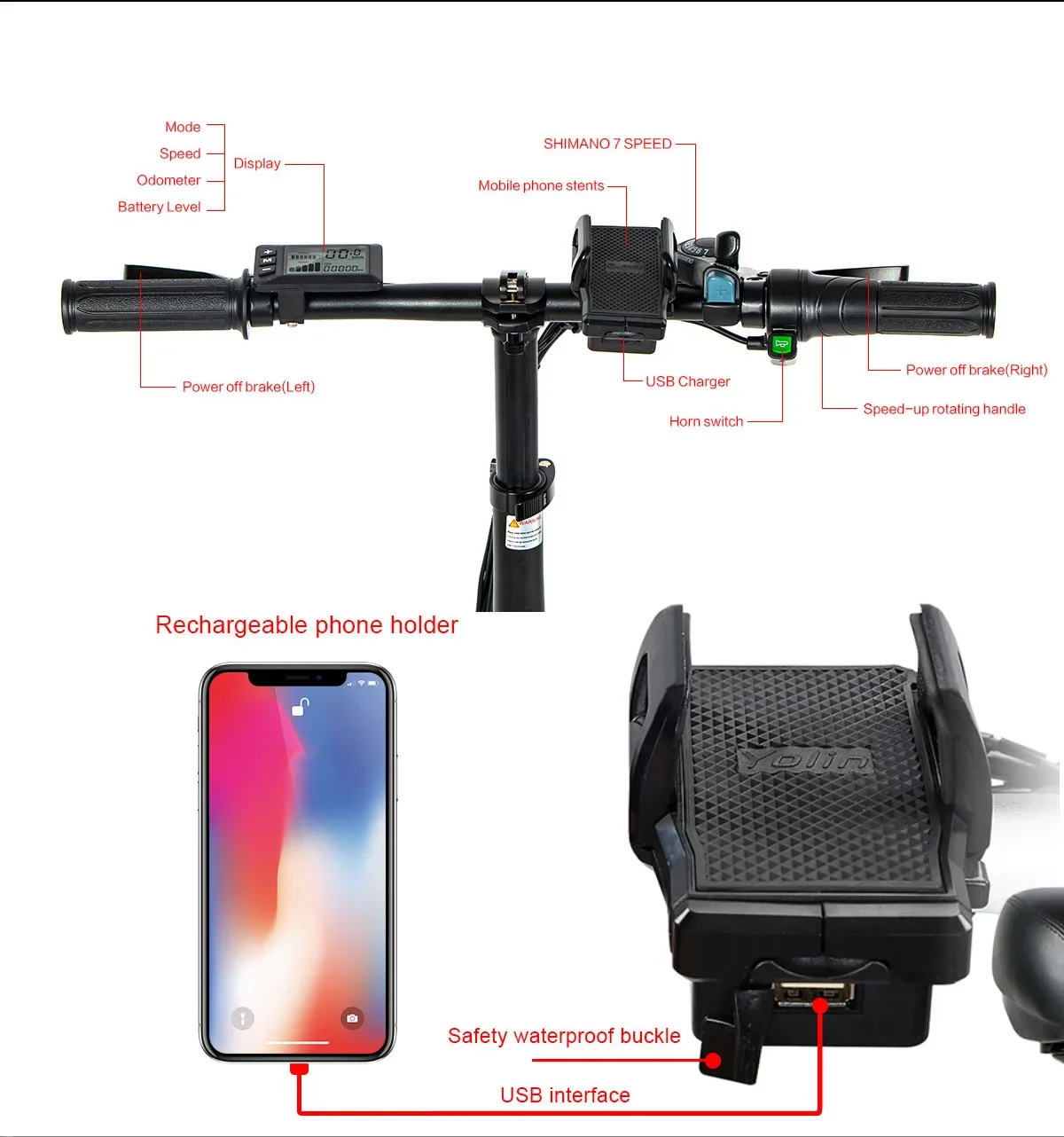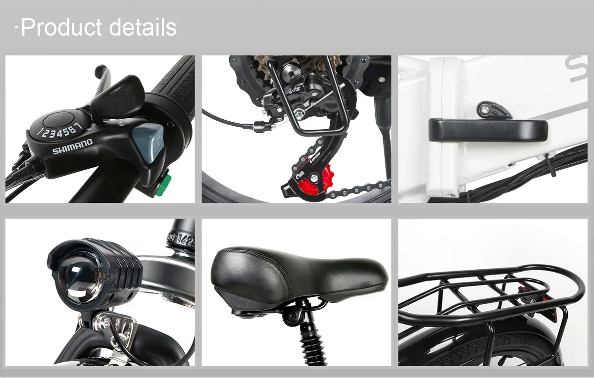 Shimano 7-speed derailleur kit, lower knot bend, sensitive shifting without falling off the chain. The pedal force is lower, the legs do not tire so quickly, the speed is strong and it is easier to climb uphill. Foldable electric bike also has a USB charging mobile phone holder that can be connected to a mobile phone for charging.