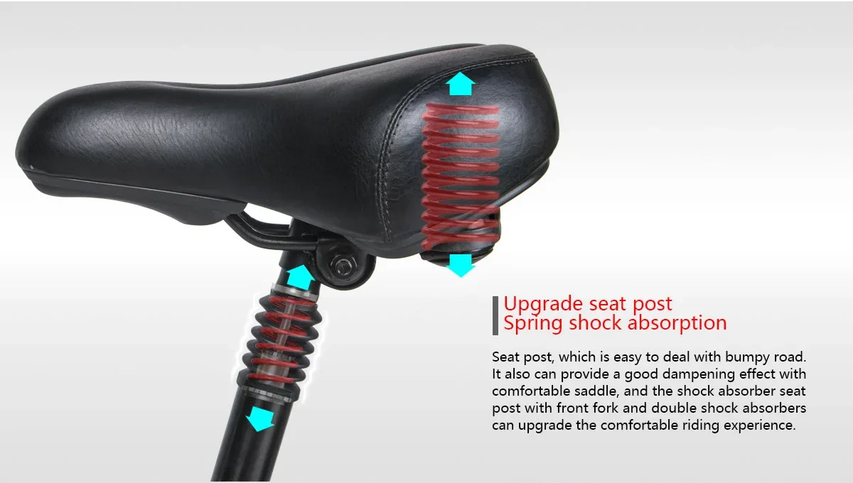 Die gefederte Vorderradgabel und der Sattel sollen stoßdämpfend sein und die Sitz- und Lenkerhöhe für komfortables Fahren einstellbar sein.