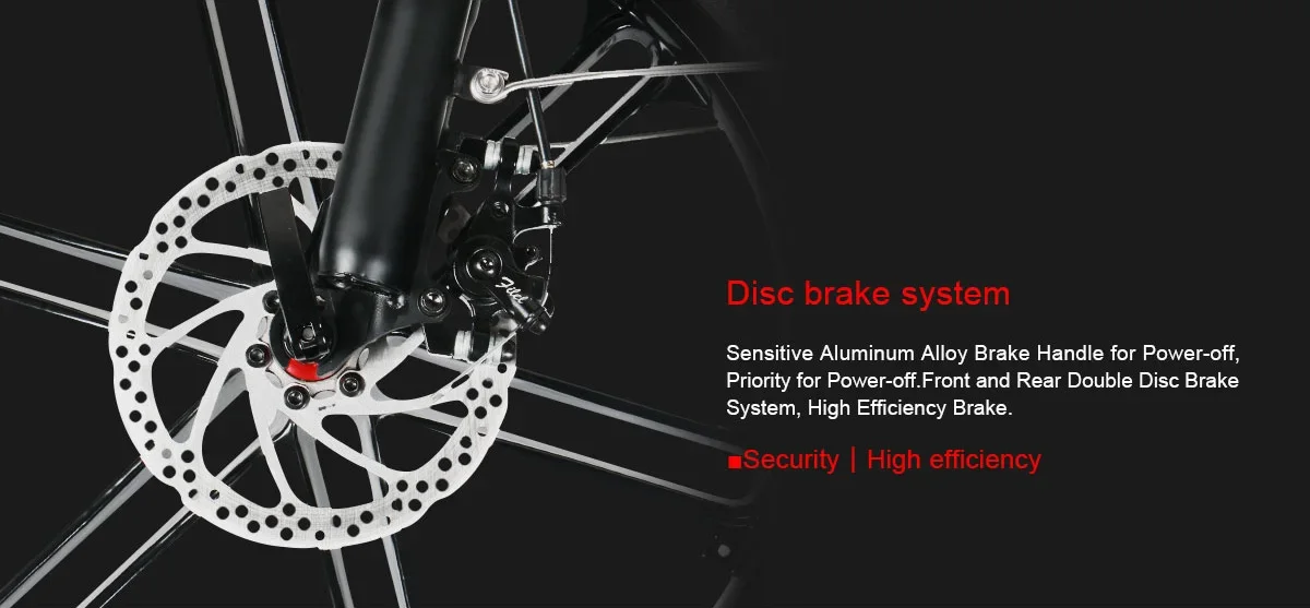 E-bike spring damping of the front fork, which effectively dampens bumps caused by complex terrain; sturdy folding frame made of aluminium alloy, adjustable handlebar tube made of aluminium alloy and EBS double disc brake system for safety. Service life, driving more comfortable and safer.