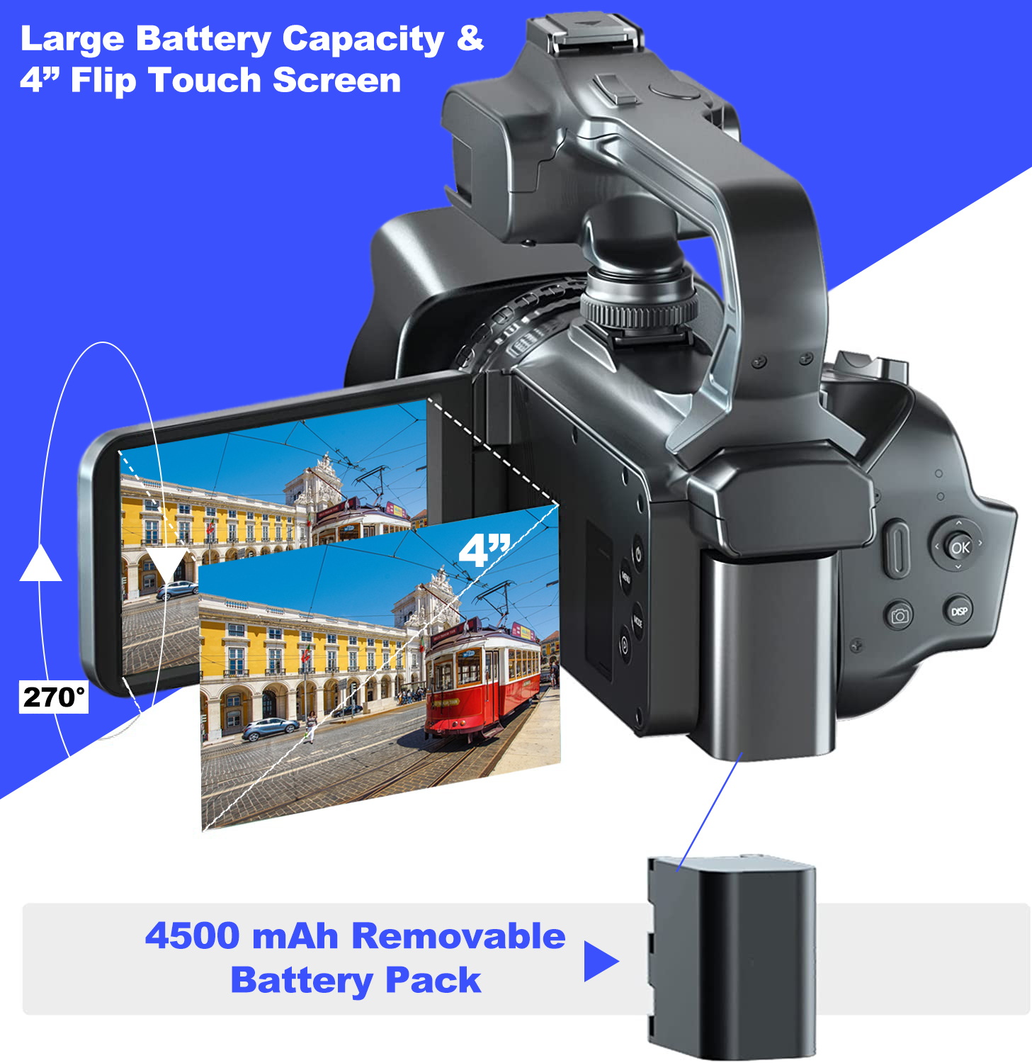 The 4.0” touchscreen flips 270°, ideal for self-filming and dynamic angles.