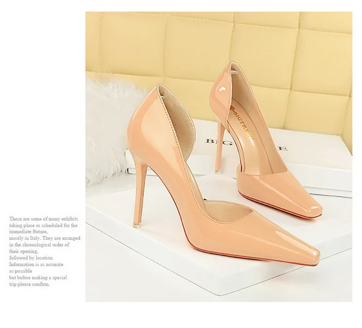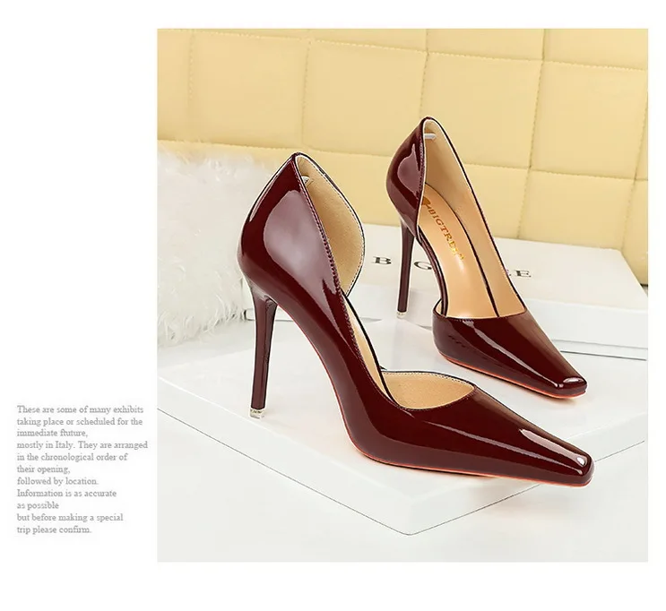 Popular elements: European style fashion simple high heels side hollow-out bright patent leather square head sexy slimming party