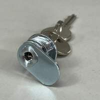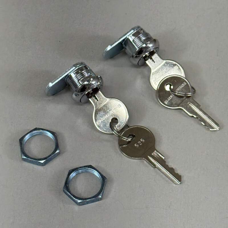 PRIME LINE Drawer & Cabinet Lock Set Condition: New Size: 5/8" Length Pack Size: 2 Piece Color: Chrome Description: Stainless Steel Finish Can be Mounted to metal, wood & Drawer Panels Comes With: 4- Keys Two Trim Collars Two Fasteners