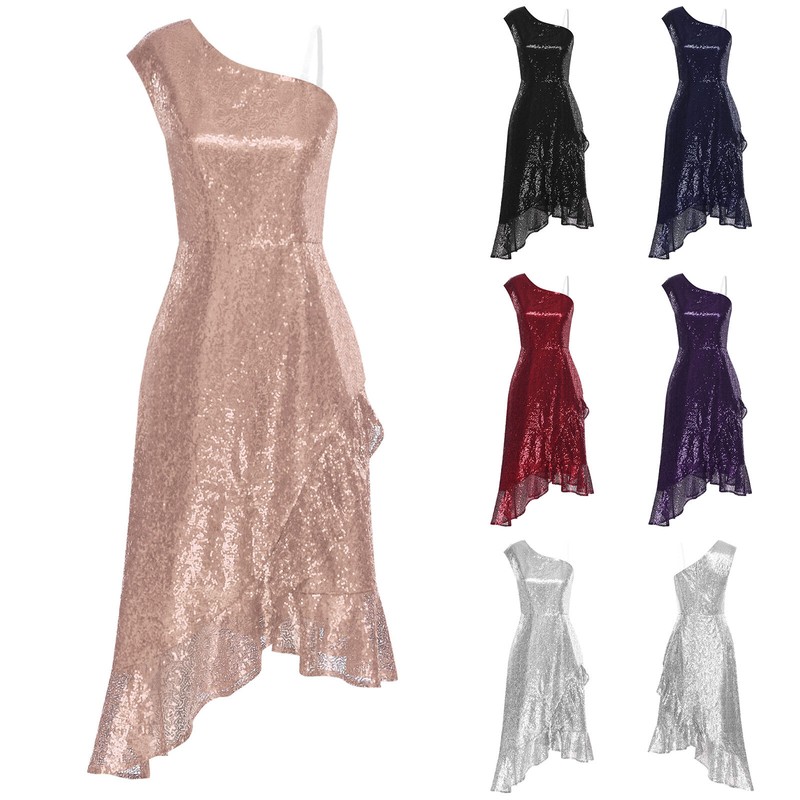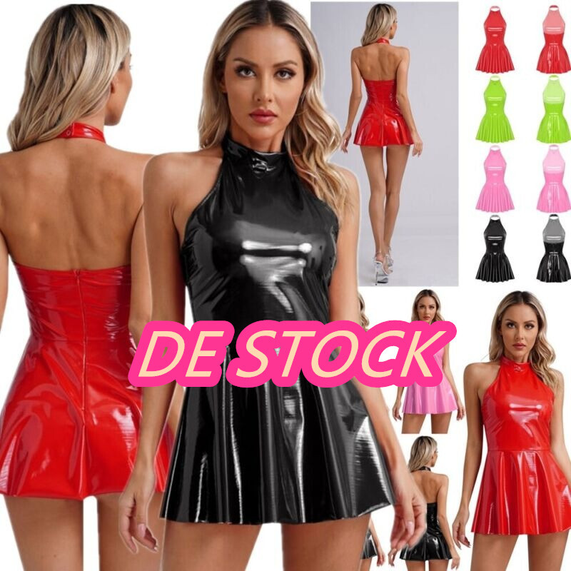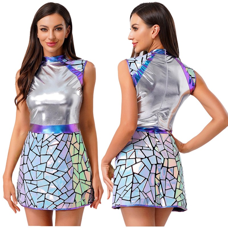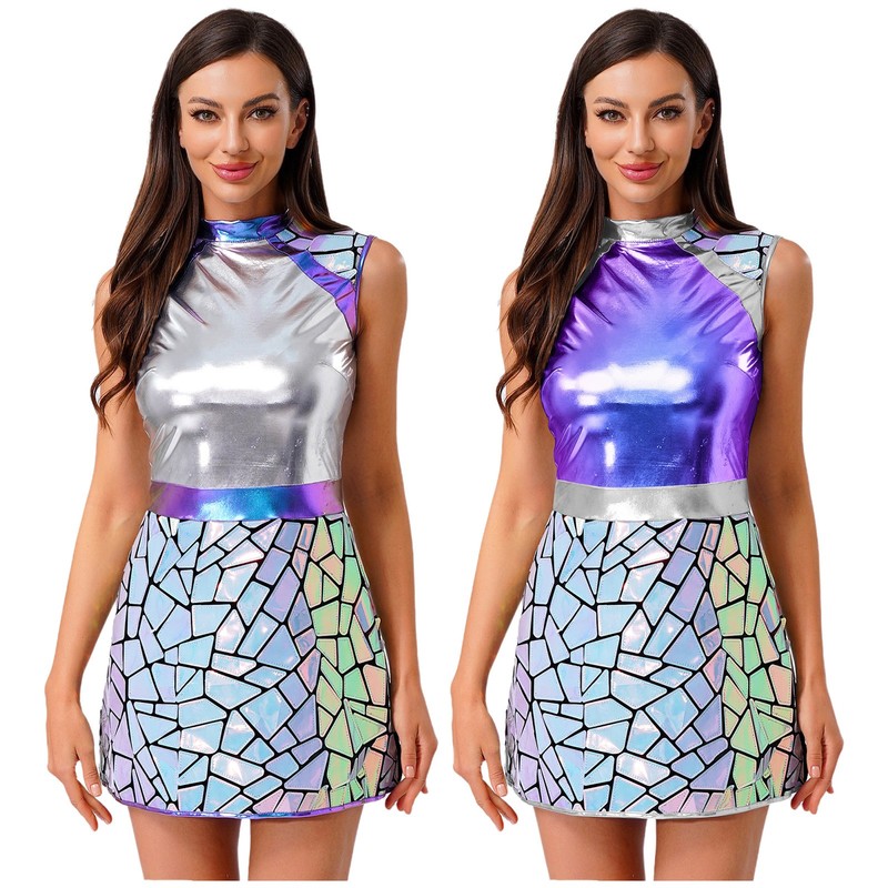 Damen Alien Astronauten Kleid Glitzer Metallic Mini Ärmellos Halloween Cosplay