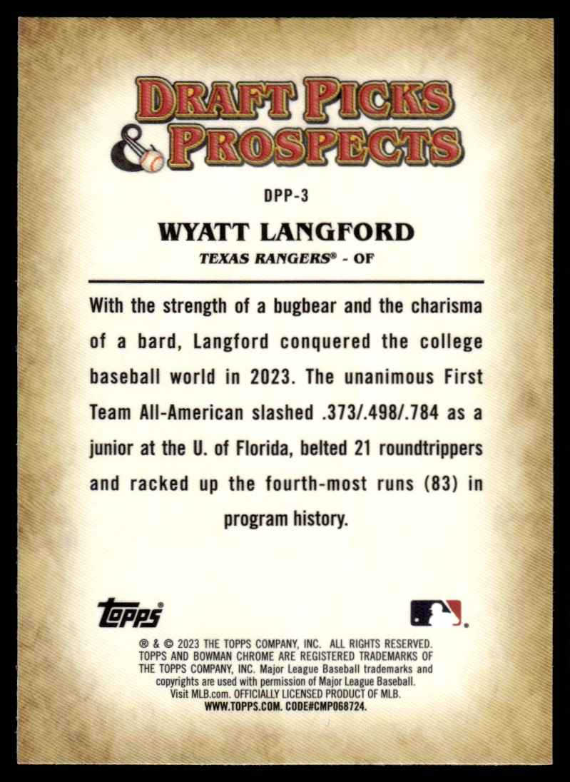 | 2023 Bowman Draft Picks and Prospects Wyatt Langford RC Texas Rangers #DPP-3 |