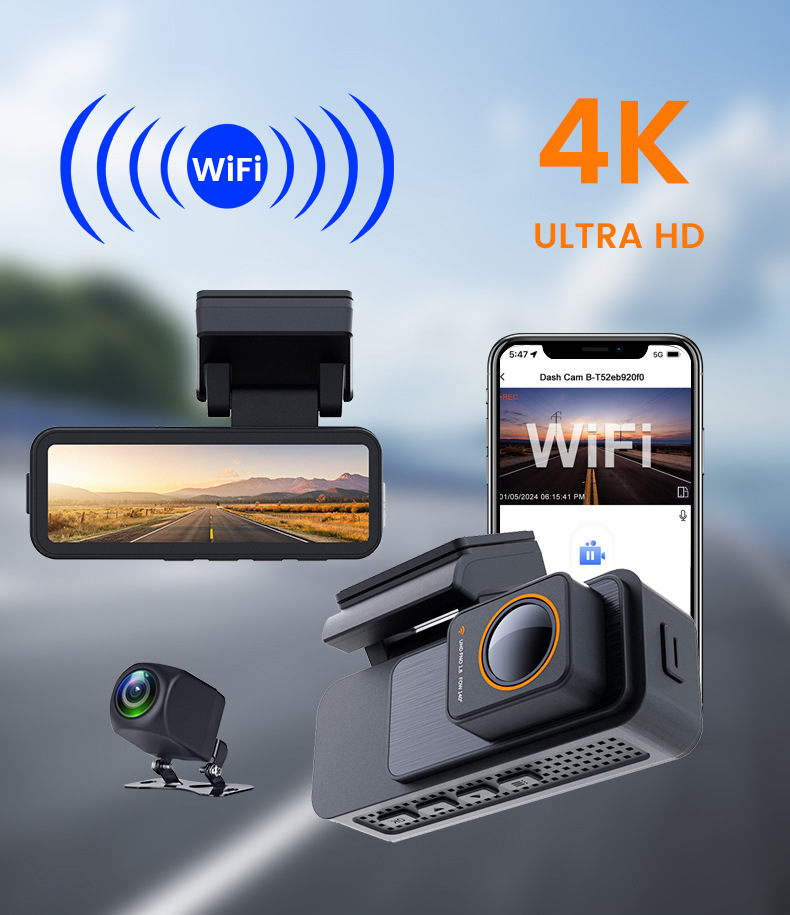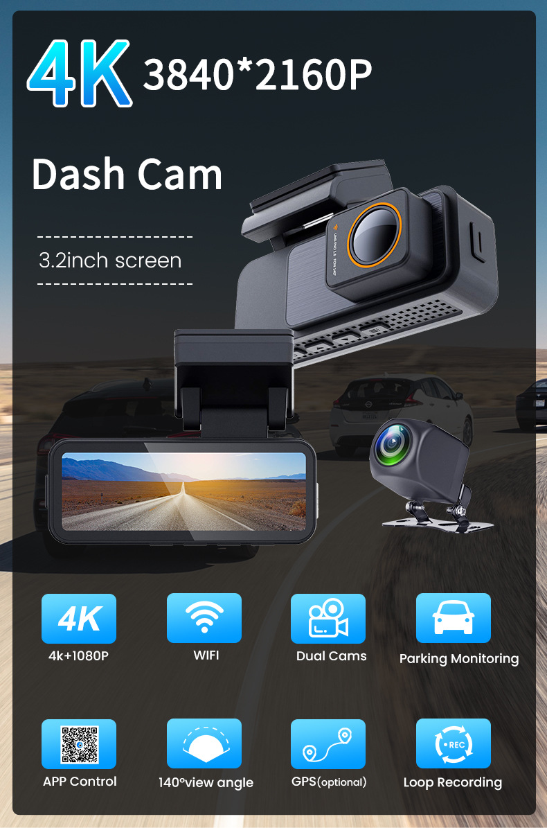 3.2 Inch 4K 2160P Dash Cam Dual Lens Ultra HD Real Car DVR Camera WIFI GPS Rear View Night Vision WDR Video Recorder 24H Parking