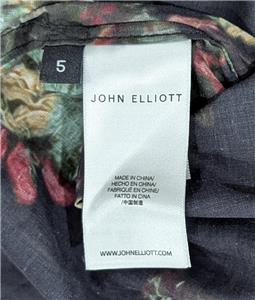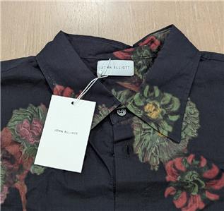 - John Elliott offers the Cloak button-front shirt in lightweight cotton with a floral print, featuring a curved hem, button placket, chest pocket, barrel cuffs, and a pointed collar.