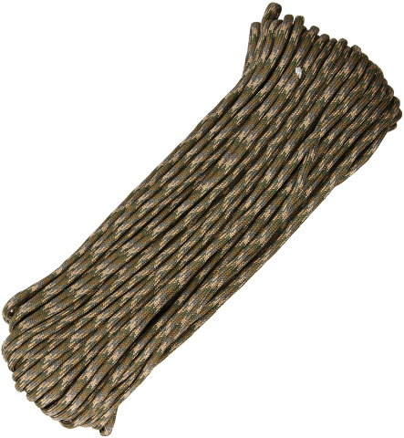 Parachute Cord Parachute Cord Multi-Cam 100ft Ideal for camping, boating, crabbing, indoor and outdoor clotheslines, halyard lines, garden lines, venetian blinds, awning lines and many other applications requiring strength and durability. Nylon cord. Rated for 550 lbs. 7 strand. Made in U.S.A. Color: Multi-cam. Color may vary due to the dye lots.