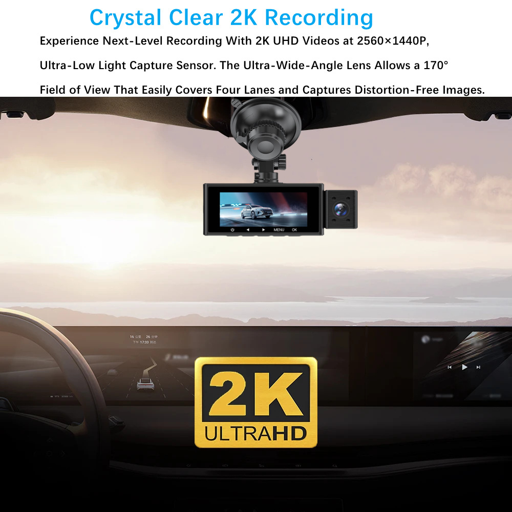Experience next-level recording with 2K UHD videos at 2560×1440p, backed by Novatek NT96670 Processor and a best-in-class GC4653 & Sony IMX307 & GC2053 Ultra-low light capture sensor. The ultra-wide-angle lens allows a 170° field of view that easily covers four lanes and captures distortion-free images.