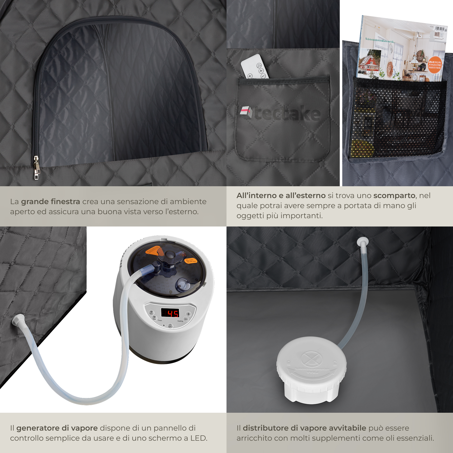 La sauna portatile contiene tutto ciò di cui hai bisogno per una pausa rilassante: la sedia pieghevole con pratica tasca laterale garantisce un elevato comfort, mentre l'ampia finestra con cerniera offre luce, vista e una circolazione dell'aria mirata. Il tappetino assorbente protegge il pavimento, mentre la tasca interna ed esterna offrono spazio per oggetti personali come smartphone, libri o prodotti per la cura personale.