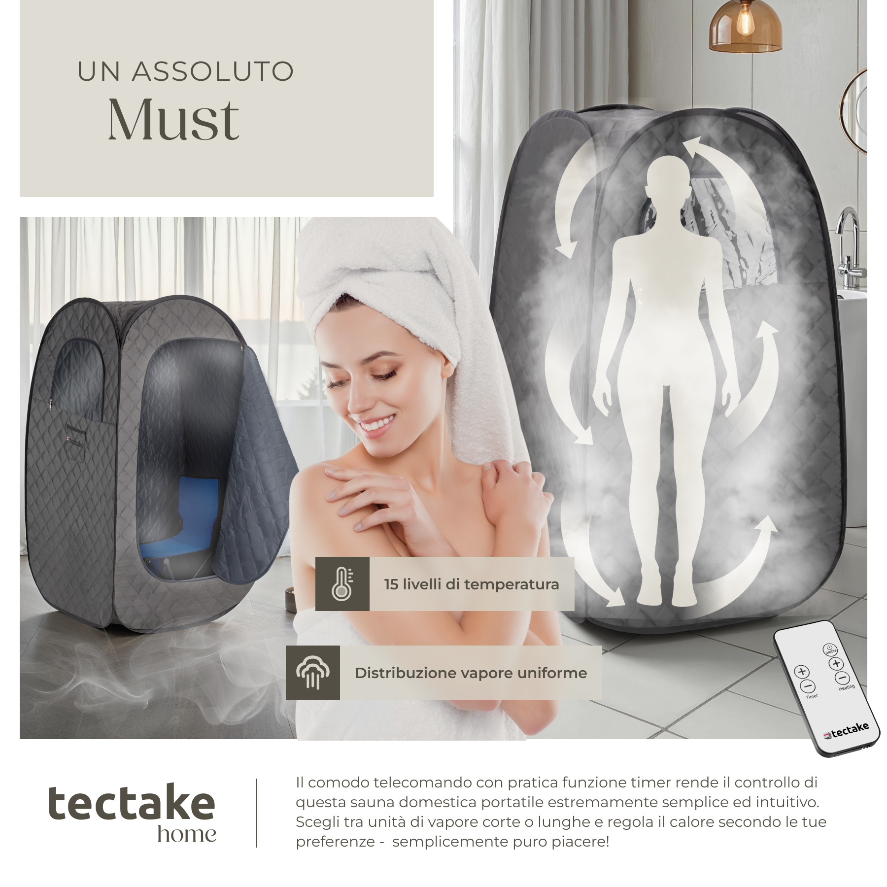 Il telecomando incluso con pratica funzione timer e 15 livelli di temperatura rende il controllo di questa sauna domestica particolarmente semplice. Scegli tra sessioni di vapore brevi o prolungate e adatta il calore alle tue esigenze: il controllo è nelle tue mani.