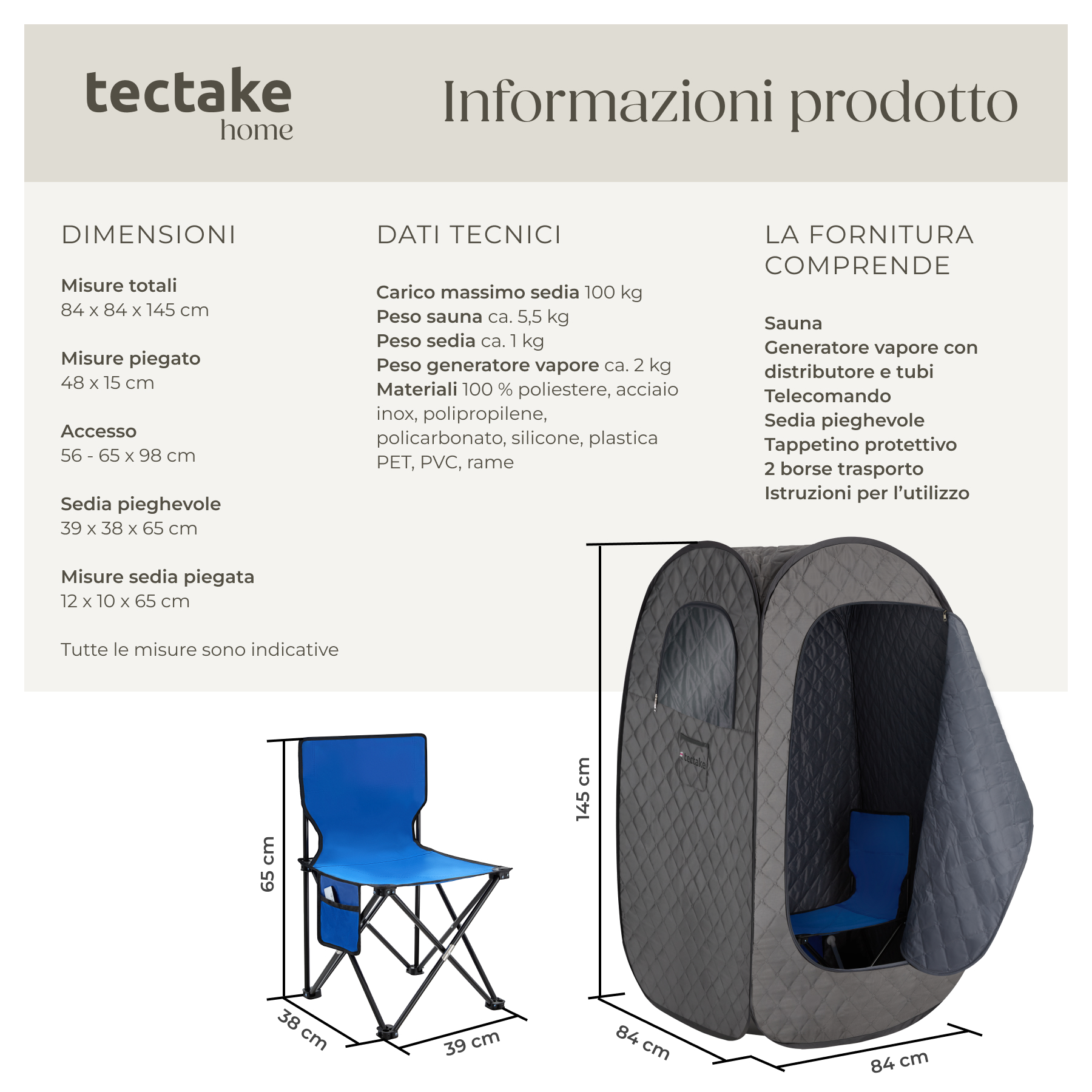 - Dimensioni totali (LxPxA): ca. 84 x 84 x 145 cm
