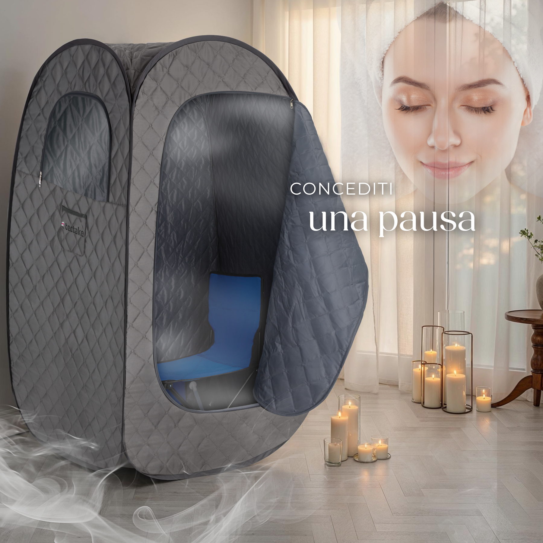 Vuoi prenderti cura della tua pelle, alleviare i dolori, ridurre lo stress o migliorare il sonno? Con la sauna a vapore portatile ThermaLuxe I di tectake potrai creare la tua personale oasi di benessere. Bastano pochi minuti per raggiungere la temperatura di esercizio e garantire un'esperienza salutare e benefica, perfetta per ritrovare l'equilibrio dopo una lunga giornata.
