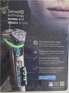 Philips Norelco Shaver 9800 delivers superior closeness and personalized skin comfort with SenseIQ technology. Designed to prevent skin irritation, the 9500 features Pressure Guard Sensor which guides you to the the right pressure as you shave. You'll also get superior closeness thanks to the Dual Steel Precision Blades: two layers of blades which improve cutting speed and efficiency. Only Philips has ComfortGlide rings, a special anti-friction coating to protect your face from redness and irritation.
